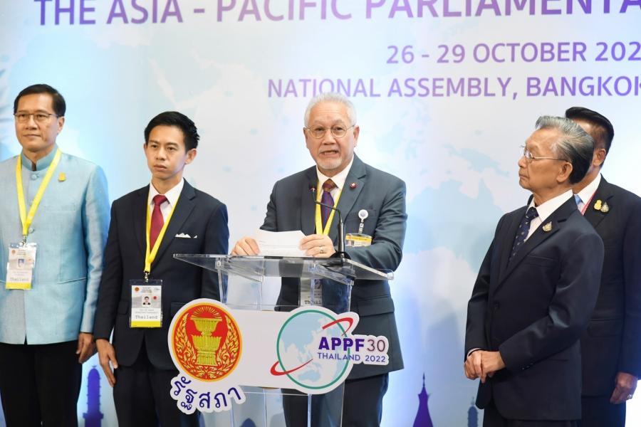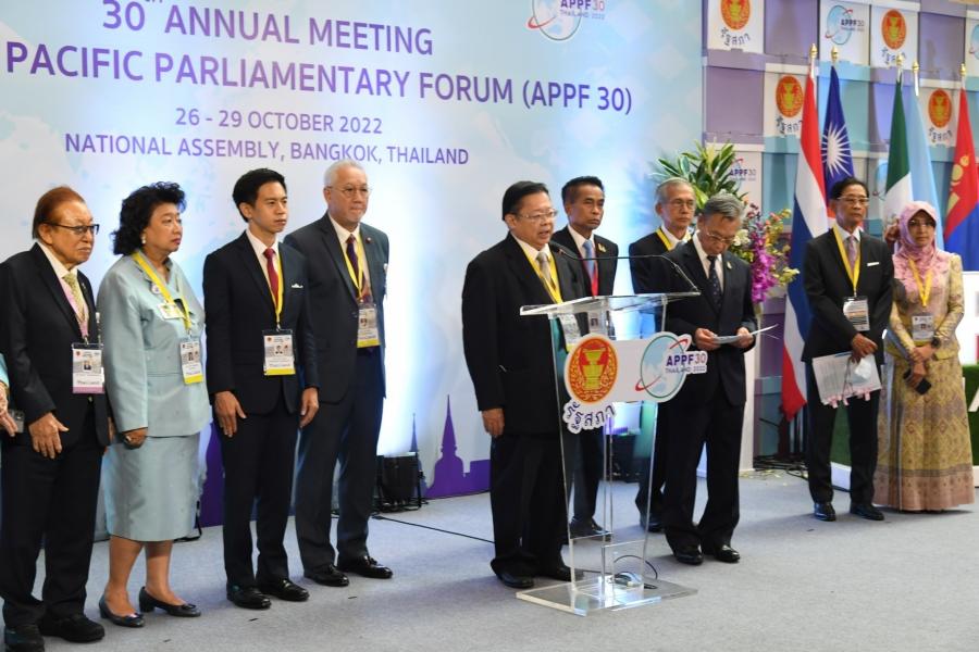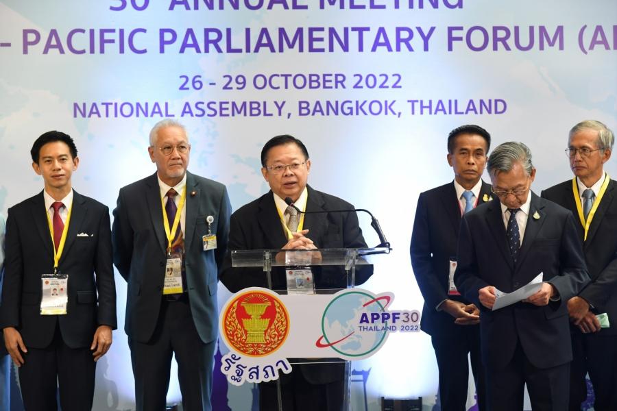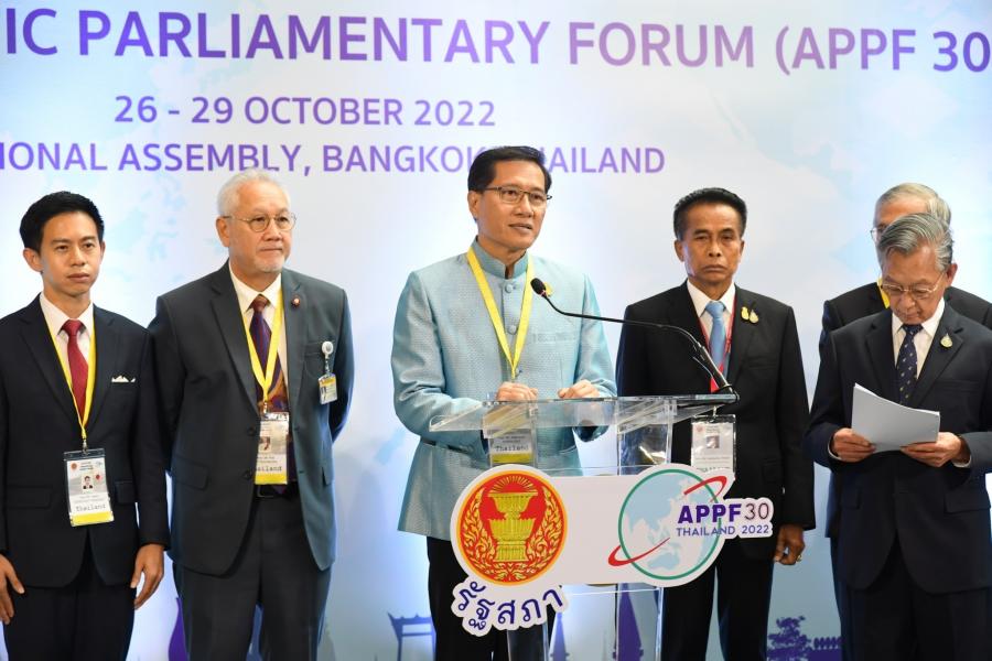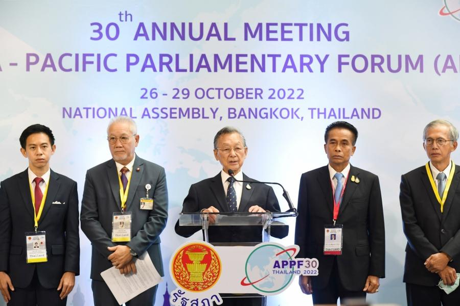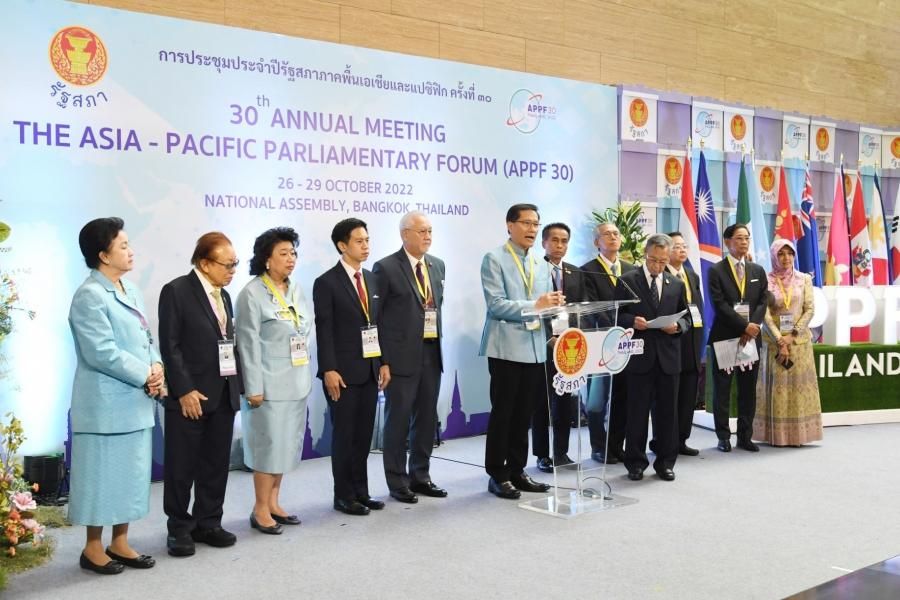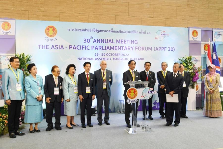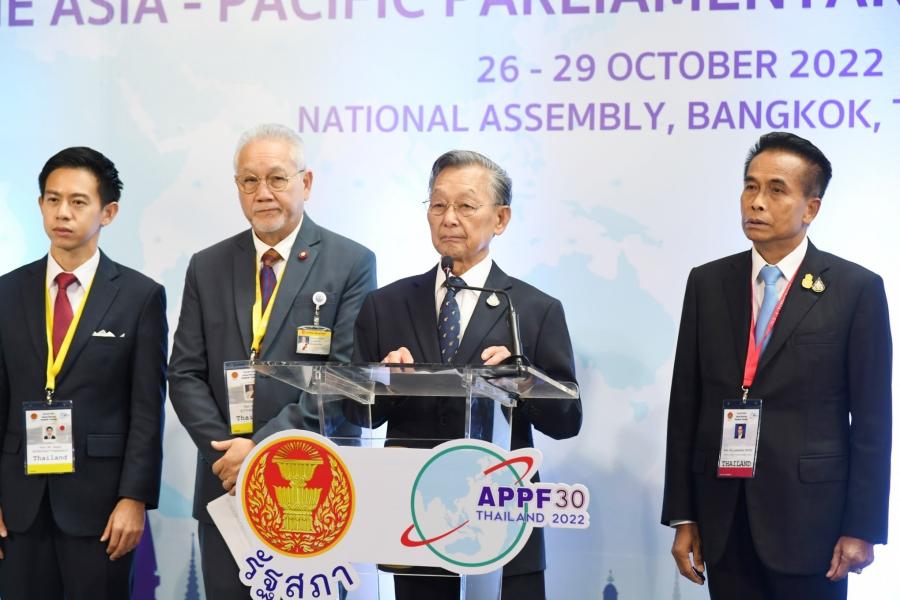 วันศุกร์ที่ 28 ตุลาคม 2565 เวลา 15.45 นาฬิกา ณ บริเวณด้านหน้าห้องประชุมใหญ่ ชั้น B2 อาคารรัฐสภา นายชวน หลีกภัย ประธานรัฐสภา ในฐานะประธานเจ้าภาพการประชุมประจำปีรัฐสภาภาคพื้นเอเชียและแปซิฟิก ครั้งที่ ๓๐ หรือ APPF ครั้งที่ ๓๐ และประธานคณะกรรมการบริหาร แถลงข่าวภายหลังพิธีปิดการประชุม โดยมี นายศุภชัย โพธิ์สุ รองประธานสภาผู้แทนราษฎร คนที่สอง และประธานคณะอนุกรรมการแต่ละด้าน ร่วมในพิธี