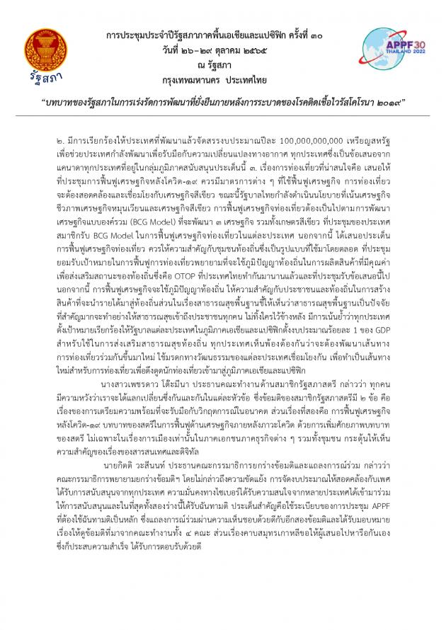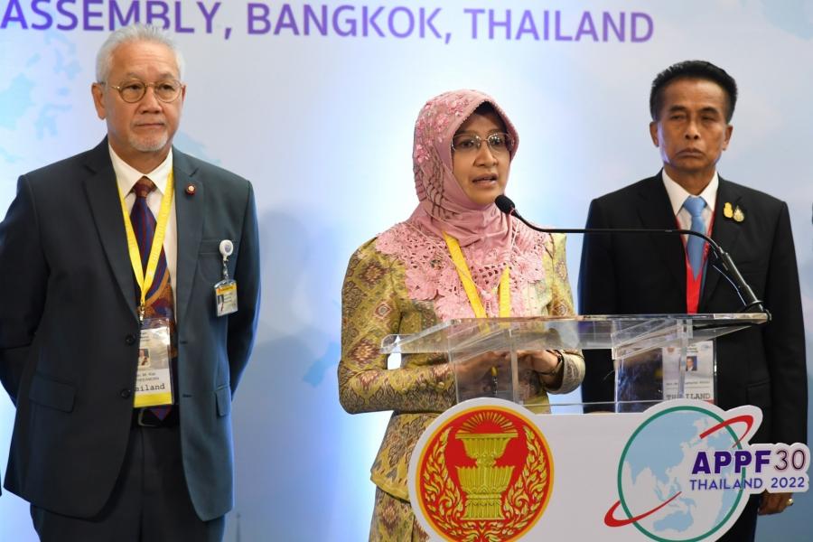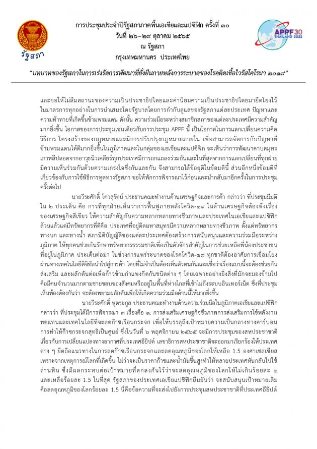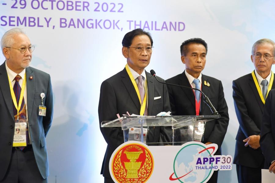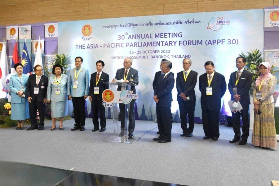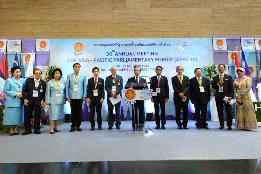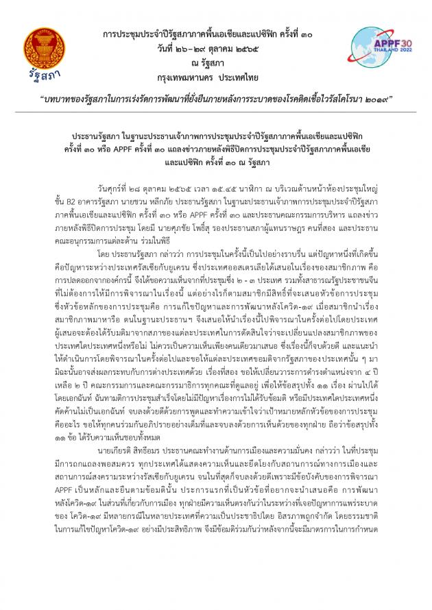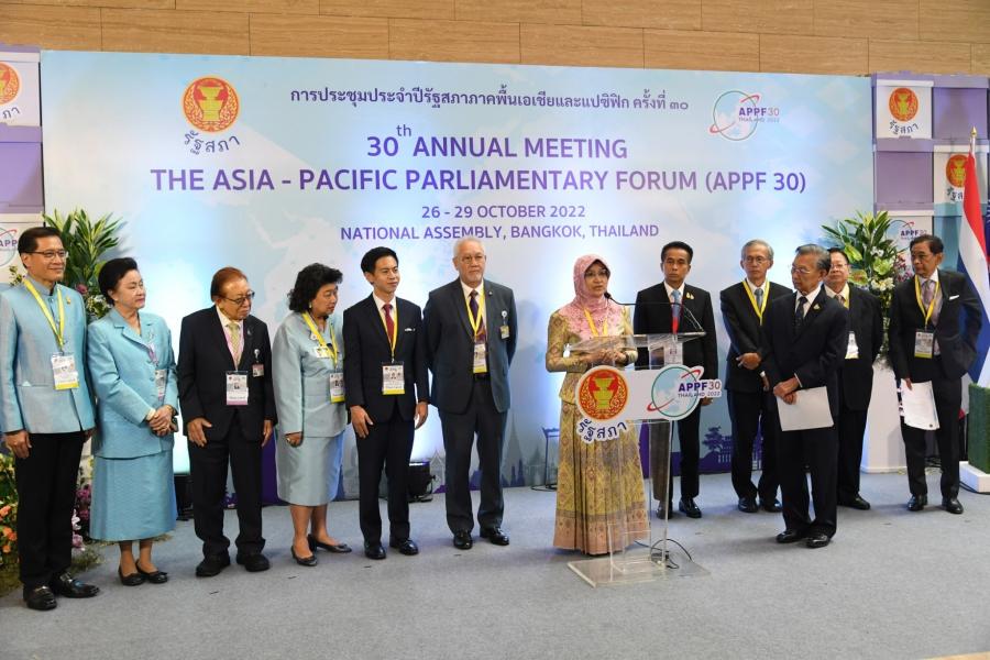 วันศุกร์ที่ 28 ตุลาคม 2565 เวลา 15.45 นาฬิกา ณ บริเวณด้านหน้าห้องประชุมใหญ่ ชั้น B2 อาคารรัฐสภา นายชวน หลีกภัย ประธานรัฐสภา ในฐานะประธานเจ้าภาพการประชุมประจำปีรัฐสภาภาคพื้นเอเชียและแปซิฟิก ครั้งที่ ๓๐ หรือ APPF ครั้งที่ ๓๐ และประธานคณะกรรมการบริหาร แถลงข่าวภายหลังพิธีปิดการประชุม โดยมี นายศุภชัย โพธิ์สุ รองประธานสภาผู้แทนราษฎร คนที่สอง และประธานคณะอนุกรรมการแต่ละด้าน ร่วมในพิธี
