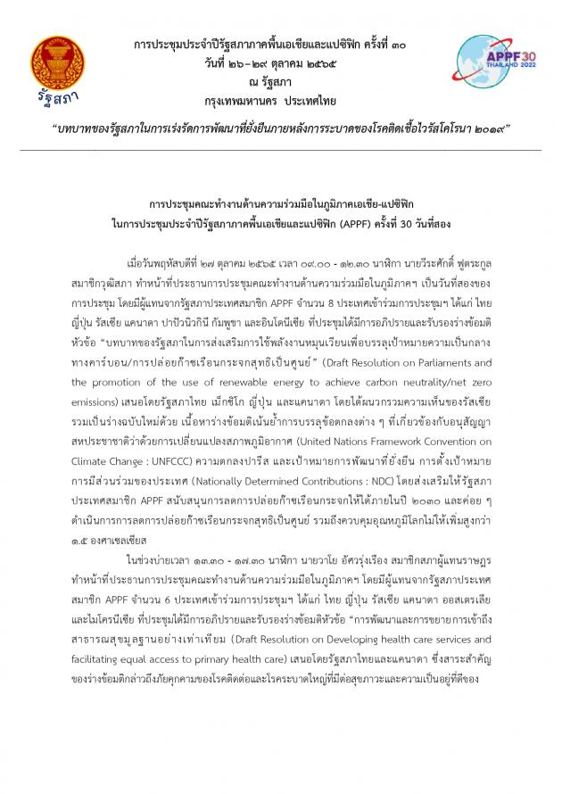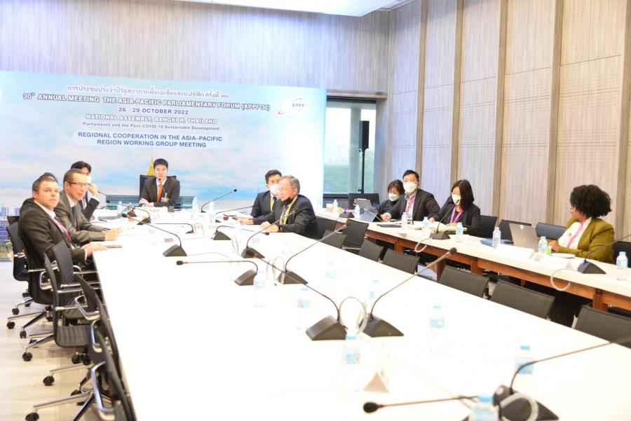 เมื่อวันที่ 27 ตุลาคม 2565 เวลา 09.00 – 12.30 นาฬิกา นายวีระศักดิ์ ฟูตระกูล สมาชิกวุฒิสภา ทำหน้าที่ประธานการประชุมคณะทำงานด้านความร่วมมือในภูมิภาคฯ เป็นวันที่สองของการประชุม โดยมีผู้แทนจากรัฐสภาประเทศสมาชิก APPF จำนวน 8 ประเทศเข้าร่วมการประชุมฯ