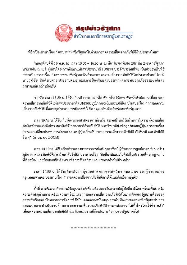 วันพฤหัสบดีที่ 10 พฤศจิกายน 2565 เวลา 13.00 – 16.30 นาฬิกา ณ ห้องรับรองพิเศษ 207 ชั้น 2 อาคารรัฐสภา  นายเรอโน เมแยร์  ผู้แทนโครงการพัฒนาแห่งสหประชาชาติ (UNDP) ประจำประเทศไทย เป็นประธานในพิธีกล่าวเปิดเสวนาเรื่อง “บทบาทสมาชิกรัฐสภาในด้านการลดความเสี่ยงจากภัยพิบัติในประเทศไทย”  โดยมี นายวุฒิชัย  กิตติธเนศวร ประธานคณะ กมธ.การป้องกันและบรรเทาผลกระทบจากภัยธรรมชาติและสาธารณภัย กล่าวต้อนรับ