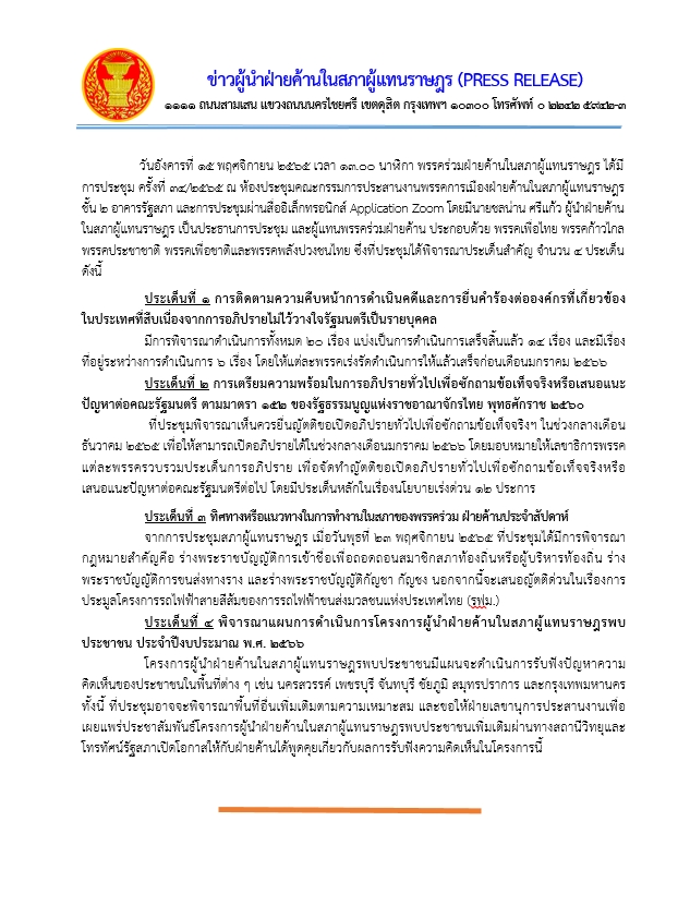 วันอังคารที่ 15 พฤศจิกายน 2565 เวลา 13.00 นาฬิกา ณ ห้องประชุมคณะกรรมการประสานงานพรรคการเมืองฝ่ายค้านในสภาผู้แทนราษฎร ชั้น 2 อาคารรัฐสภา พรรคร่วมฝ่ายค้านในสภาผู้แทนราษฎร ได้มีการประชุม ครั้งที่ 34/2565 และการประชุมผ่านสื่ออิเล็กทรอนิกส์ Application Zoom โดยมี นายชลน่าน ศรีแก้ว ผู้นำฝ่ายค้านในสภาผู้แทนราษฎร เป็นประธานการประชุม และผู้แทนพรรคร่วมฝ่ายค้าน ประกอบด้วย พรรคเพื่อไทย พรรคก้าวไกล พรรคประชาชาติ พรรคเพื่อชาติและพรรคพลังปวงชนไทย