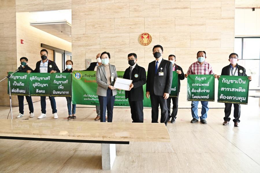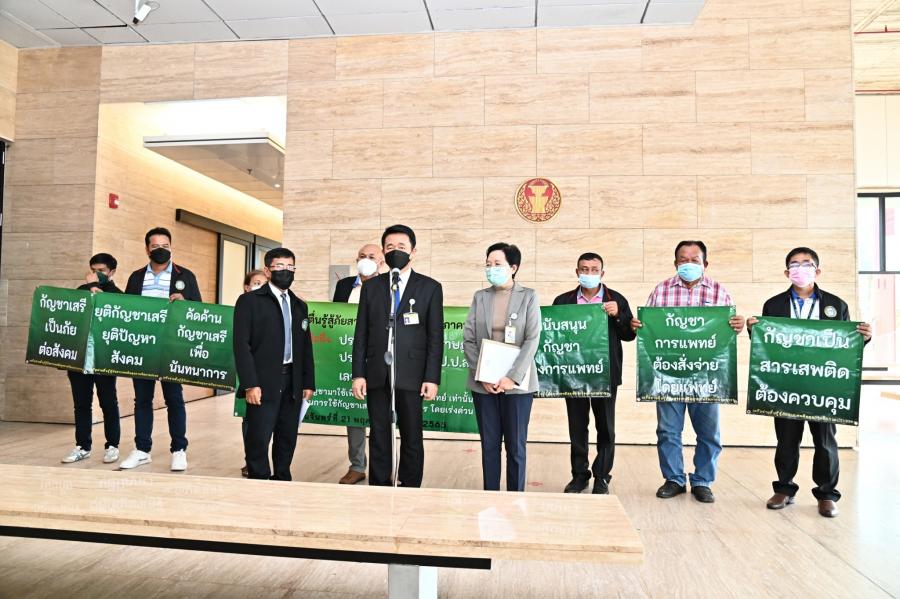 น.ส.ผ่องศรี ธาราภูมิ โฆษกประธานสภาผู้แทนราษฎร เป็นตัวแทนนายชวน หลีกภัย ประธานสภาผู้แทนราษฎร รับยื่นหนังสือจากเครือข่ายตื่นรู้สู้ภัยสารเสพติดสุขภาพจิตภาคประชาชน นำโดย นายบัญญัติ เจตนจันทร์ ส.ส. พรรคประชาธิปัตย์ และนายทิวัฒน์ รัตนเกตุ รองประธานเครือข่ายฯ เรื่อง ขอให้ประธานสภาผู้แทนราษฎรช่วยผลักดันให้คณะกรรมการป้องกันและปราบปรามยาเสพติด (ป.ป.ส.) ทบทวนการปลดกัญชาออกจากยาเสพติดตามประกาศกระทรวงสาธารณสุข