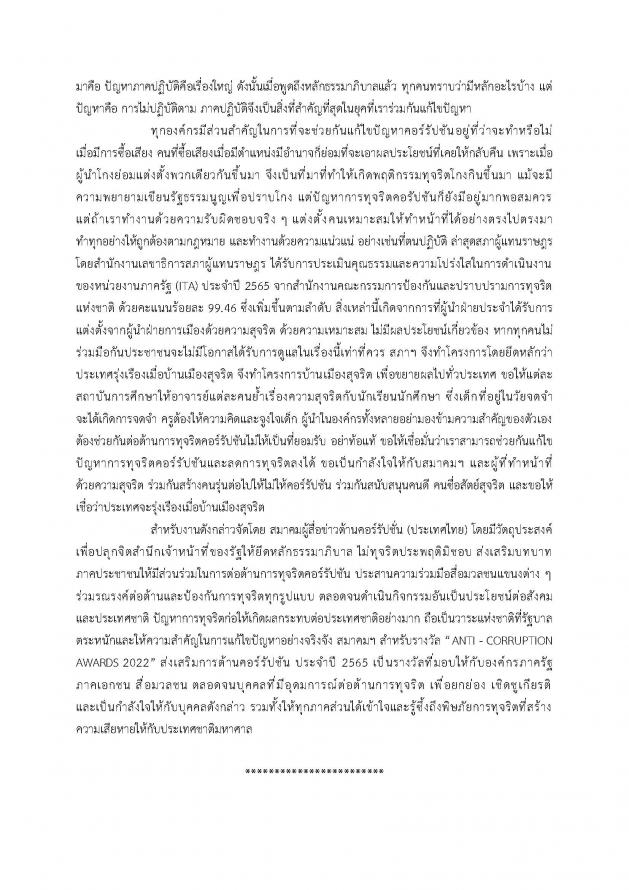 ประธานรัฐสภา เป็นประธานในพิธีมอบรางวัล ANTI – CORRUPTION AWARDS 2022 ส่งเสริมการต้านคอร์รัปชัน ประจำปี 2565