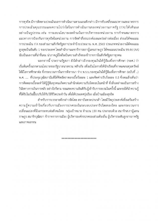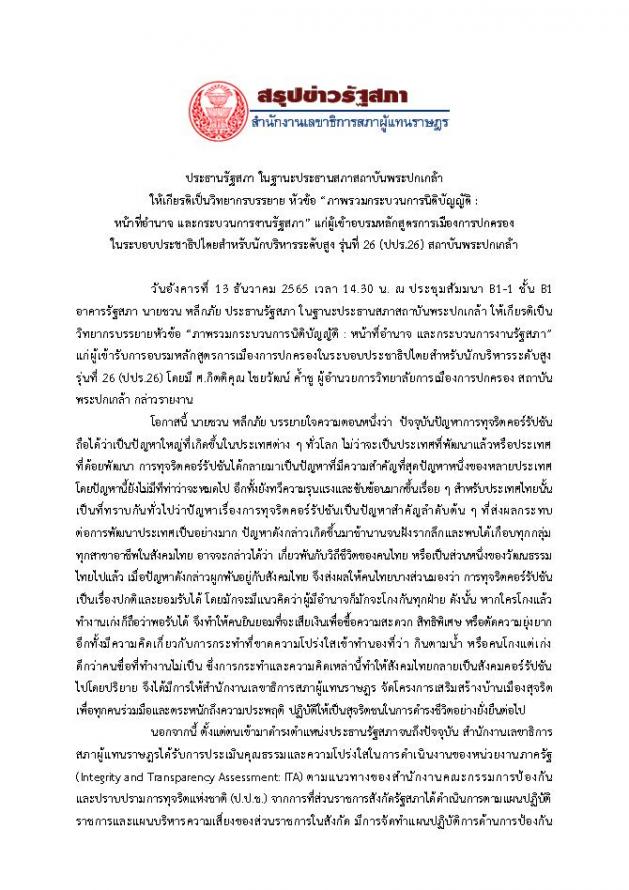ประธานรัฐสภา ในฐานะประธานสภาสถาบันพระปกเกล้า ให้เกียรติเป็นวิทยากรบรรยายหัวข้อ ภาพรวมกระบวนการนิติบัญญัติ : หน้าที่อำนาจ และกระบวนการงานรัฐสภาแก่ผู้เข้ารับการอบรมหลักสูตรการเมืองการปกครองในระบอบประชาธิปไตยสำหรับนักบริหารระดับสูง รุ่นที่ 26 (ปปร.26) สถาบันพระปกเกล้า