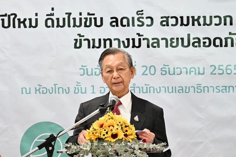 โอกาสนี้  นายชวน  หลีกภัย กล่าวใจความตอนหนึ่งว่า เรียนผู้มีเกียรติทุกท่าน ที่ได้เล็งเห็นถึงความสำคัญในการเกิดอุบัติเหตุมาโดยตลอด สำนักงานกองทุนสนับสนุนการสร้างเสริมสุขภาพ (สสส.) จัดตั้งขึ้นตามพระราชบัญญัติกองทุนสนับสนุนการสร้างเสริมสุขภาพ พ.ศ. 2544 เป็นหน่วยงานของรัฐ  โดยมีวัตถุประสงค์ เพื่อเพิ่มสุขภาวะให้กับประชาชนไทยทุกวัย ตามนโยบายสุขภาพแห่งชาติ  มุ่งลดการบริโภคสุราและยาสูบ  มุ่งลดปัจจัยเสี่ยงอื่น อันได้แก่ สารและสิ่งอื่นที่ทำลายสุขภาพ พัฒนาขีดความสามารถในการสร้างเสริมสุขภาพของชุมชนหรือองค์กรต่างๆ ทั้งนี้ ขอให้ สสส.นำประเด็นที่คนไทยได้รับผลกระทบต่อสุขภาพเป็นอย่างมาก เพื่อให้ความรู้เกี่ยวกับการป้องกัน การดูแลรักษาในขณะที่มีอาการป่วย อาทิ โรคเบาหวาน อย่างไรก็ตาม หน้าที่ของฝ่ายนิติบัญญัติได้มีการออกกฎหมายที่สำคัญ คือ พระราชบัญญัติจราจรทางบก (ฉบับที่ 13) พ.ศ. 2565  โดยมีเหตุผลและความจำเป็นในการจำกัดสิทธิและเสรีภาพของบุคคลตามพระราชบัญญัตินี้ เพื่อให้การบังคับใช้กฎหมายและการจัดระเบียบการจราจรทางบกเป็นไปอย่างมีประสิทธิภาพ อันจะเป็นประโยชน์แก่ความปลอดภัยสาธารณะ ความสงบเรียบร้อยและสวัสดิภาพของประชาชน ซึ่งในปัจจุบันนี้ สาเหตุการเสียชีวิตของคนไทยส่วนใหญ่เกิดจากอุบัติเหตุบนท้องถนน ทั้งจากการขับรถด้วยความเร็ว การไม่สวมหมวกนิรภัย และการไม่เคารพกฎจราจร ล้วนแล้วแต่เป็นเหตุให้เกิดอุบัติเหตุได้ง่าย โดยเฉพาะการดื่มแอลกอฮอล์แม้ว่าจะดื่มเพียงเล็กน้อย แต่ก็อาจส่งผลต่อการควบคุมสติในการขับขี่ได้ซึ่งเป็นเหตุสำคัญที่ทำให้เกิดอุบัติเหตุบนท้องถนน เกิดการบาดเจ็บและเสียชีวิต อยู่เป็นประจำทุกปี  ด้วยเหตุผลดังกล่าวข้างต้นนั้น เกิดมาจากคนไทยขาดการมีวินัยในการปฏิบัติตามระเบียบวินัย กฎเกณฑ์ต่าง ๆ โดยเมื่อหลายปีก่อนประเทศไทยได้เกิดอุบัติเหตุเป็นอันดับต้น ๆ ของโลก  แต่ปัจจุบันการเกิดอุบัติเหตุบนท้องถนนลดลงตามลำดับ จึงขอให้ สสส.ประสานงานกับบริษัทผู้ผลิตเครื่องดื่มแอลกอฮอล์และบริษัทผู้จำหน่ายรถจักรยานยนต์ รถยนต์ โดยขอความร่วมมือให้มีการอบรมให้ความรู้กับผู้ซื้อรถดังกล่าว เพื่อให้มีวินัยในการขับขี่ รวมทั้งการเคารพกฎจราจร เพื่อลดความสูญเสียในชีวิตและทรัพย์สินจากอุบัติเหตุดังนั้น จึงขอฝากให้ สสส.รณรงค์เรื่องดังกล่าวตลอดทั้งปี  โดยไม่เน้นเฉพาะเทศกาลใด ๆ และขอขอบคุณทุกฝ่ายที่เกี่ยวข้องในการจัดกิจกรรมในครั้งนี้