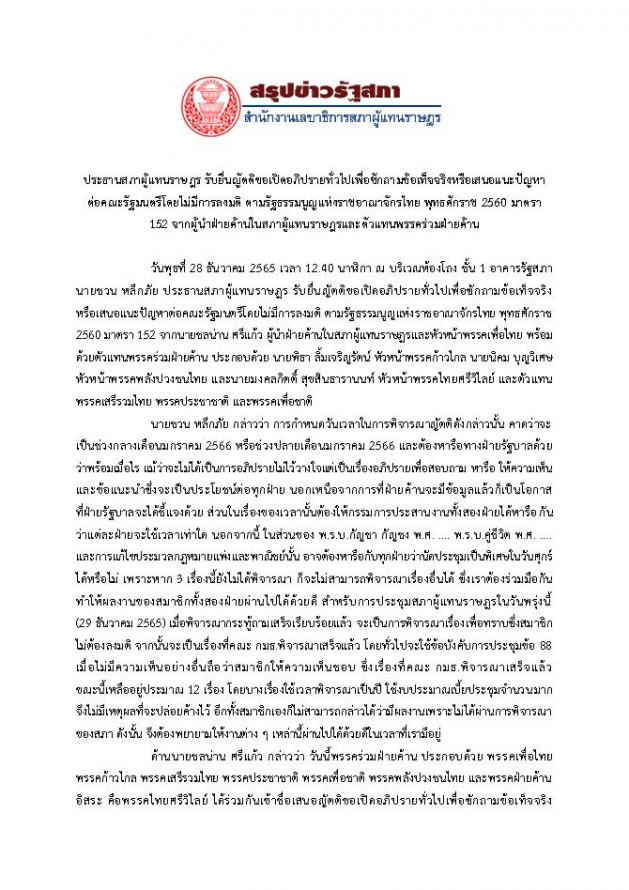 ประธานสภาผู้แทนราษฎร รับยื่นญัตติขอเปิดอภิปรายทั่วไปเพื่อซักถามข้อเท็จจริงหรือเสนอแนะปัญหาต่อคณะรัฐมนตรี โดยไม่มีการลงมติตามรัฐธรรมนูญแห่งราชอาณาจักรไทย พุทธศักราช 2560 มาตรา 152 จากผู้นำฝ่ายค้านในสภาผู้แทนราษฎรและหัวหน้าพรรคเพื่อไทย พร้อมด้วยตัวแทนพรรคร่วมฝ่ายค้าน