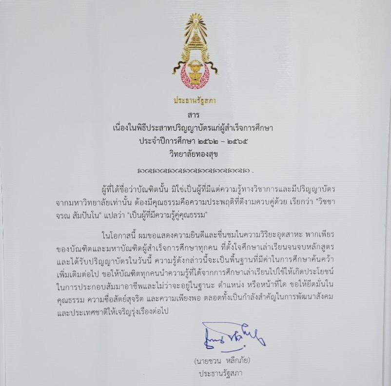 ประธานรัฐสภา เป็นประธานในพิธีประสาทปริญญาบัตร ประจำปีการศึกษา 2562 - 2565 แก่ผู้เข้ารับปริญญากิตติมศักดิ์ มหาบัณฑิต และบัณฑิต วิทยาลัยทองสุข