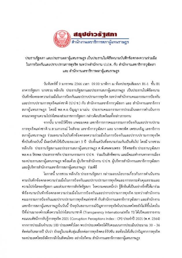 วันจันทร์ที่ 9 มกราคม 2566 เวลา 09.00 นาฬิกา ณ ห้องประชุมสัมมนา B1-1 ชั้น B1 อาคารรัฐสภา นายชวน หลีกภัย ประธานรัฐสภาและประธานสภาผู้แทนราษฎร เป็นประธานในพิธีลงนามบันทึกข้อตกลงความร่วมมือในการป้องกันและปราบปรามการทุจริต ระหว่างสำนักงาน ป.ป.ช. กับ สำนักงานเลขาธิการวุฒิสภา และสำนักงานเลขาธิการสภาผู้แทนราษฎร  โดยมี พล.ต.อ.ปัญญา มาเม่น ประธานคณะกรรมการประเมินผลการดำเนินการตามมาตรฐานความโปร่งใสของส่วนราชการรัฐสภา กล่าวต้อนรับพร้อมทั้งกล่าวรายงาน