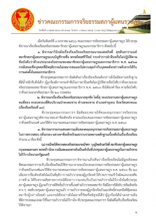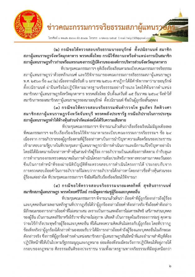 2. พิจารณาเรื่องร้องเรียนจริยธรรมสมาชิกสภาผู้แทนราษฎร กรณีครอบครองที่ดิน (เรื่องร้องเรียนที่ 30)