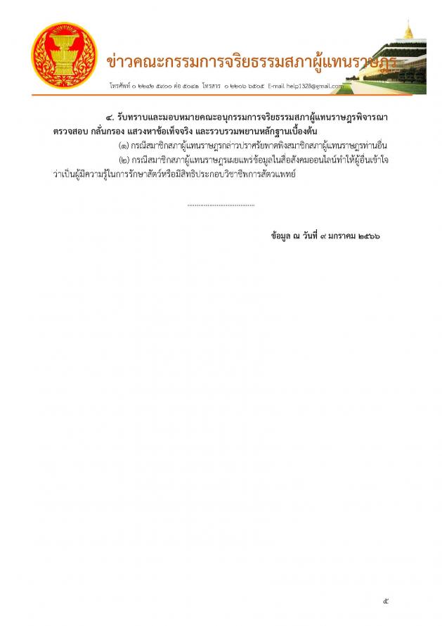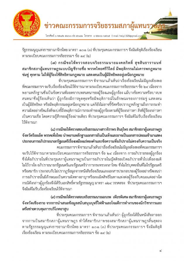 4. พิจารณารับทราบเรื่องร้องเรียนจริยธรรมสมาชิกสภาผู้แทนราษฎรและกรรมาธิการ จำนวน 2 เรื่อง