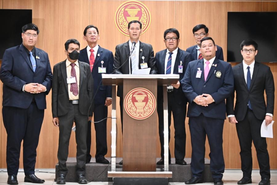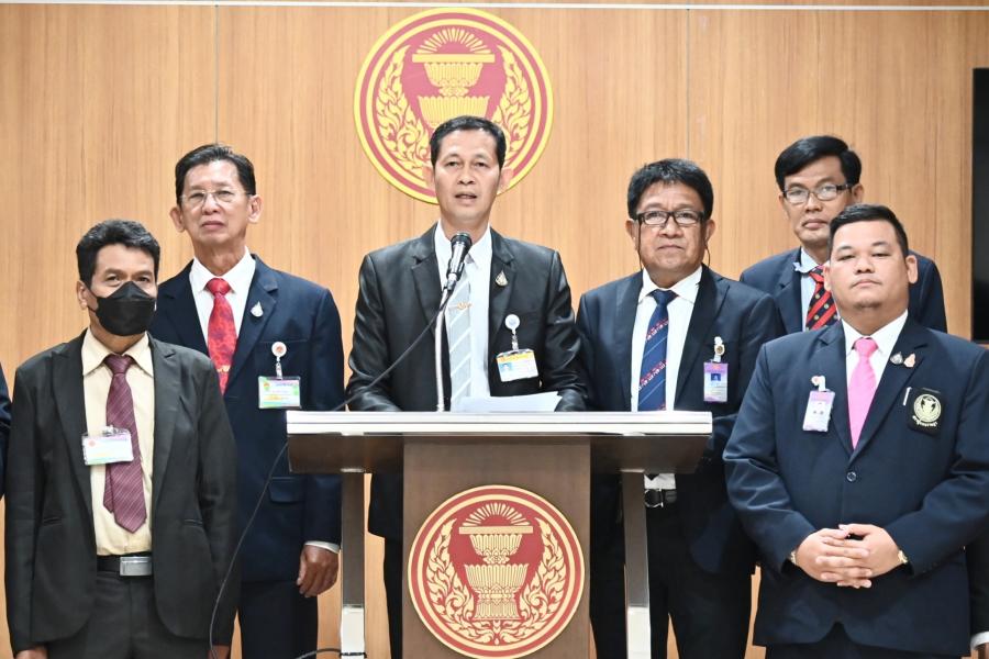 นายสัณหพจน์ สุขศรีเมือง เลขานุการคณะ กมธ.วิสามัญพิจารณาศึกษาการบริหารจัดการปาล์มน้ำมันอย่างเป็นระบบ และคณะ แถลงข่าว