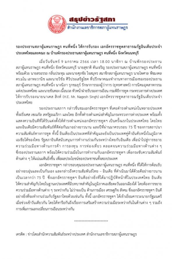 เมื่อวันจันทร์ที่ 9 มกราคม 2566 เวลา 18.00 นาฬิกา ณ บ้านพักรองประธานสภาผู้แทนราษฎร คนที่หนึ่ง จ.นนทบุรี นายสุชาติ ตันเจริญ รองประธานสภาผู้แทนราษฎร คนที่หนึ่ง ให้การรับรอง นายนาเคส สิงห์ (H.E. Mr. Nagesh Singh) เอกอัครราชทูตสาธารณรัฐอินเดียประจำประเทศไทย และคณะ โดยมี นายสรอรรถ กลิ่นประทุม และนายศุภชัย ใจสมุทร สมาชิกสภาผู้แทนราษฎร นายไพศาล พืชมงคล ดร. มโน เลาหะวานิช และนายวิชัย ศิริประเสริฐโชค ที่ปรึกษาคณะทำงานทางการเมืองของรองประธานสภาผู้แทนราษฎร คนที่หนึ่ง นางนิภา รุกขมธุร์ รักษาการรองผู้ว่าการ (ยุทธศาสตร์) การนิคมอุตสาหกรรมแห่งประเทศไทย และนายขันทอง เนื้อนวล หัวหน้าฝ่ายรับรองการเยือน กรมพิธีการทูต กระทรวงการต่างประเทศ ร่วมให้การรับรอง