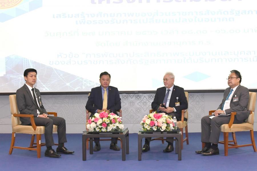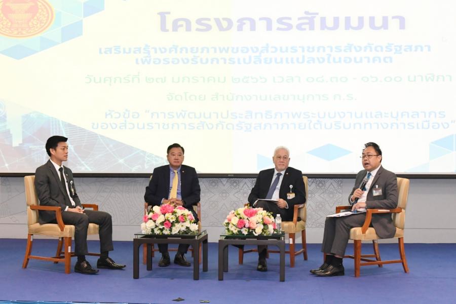 นายเกียรติ สิทธีอมร และนายณัฐพงษ์ เรืองปัญญาวุฒิ สมาชิกสภาผู้แทนราษฎร และนายสมชาย แสวงการ สมาชิกวุฒิสภา ให้เกียรติร่วมอภิปรายในหัวข้อ การพัฒนาประสิทธิภาพระบบงานและบุคลากร ของส่วนราชการสังกัดรัฐสภาภายใต้บริบททางการเมือง