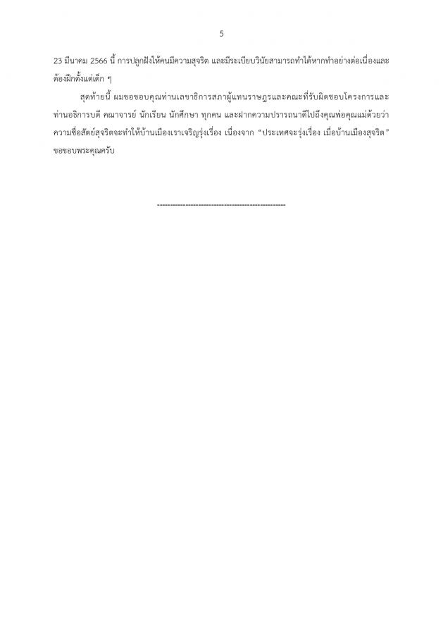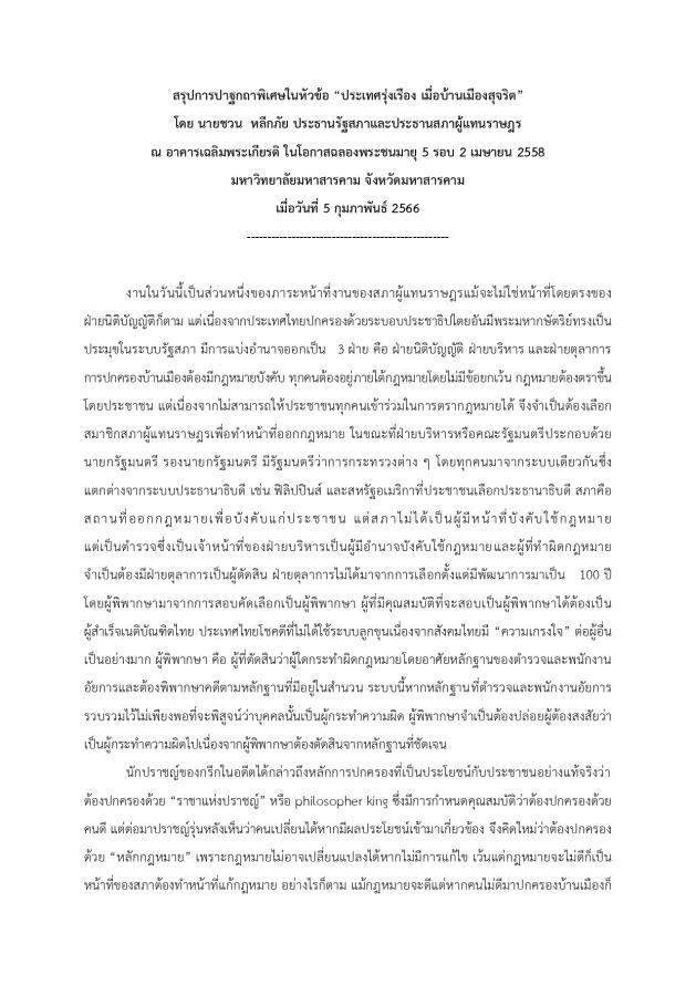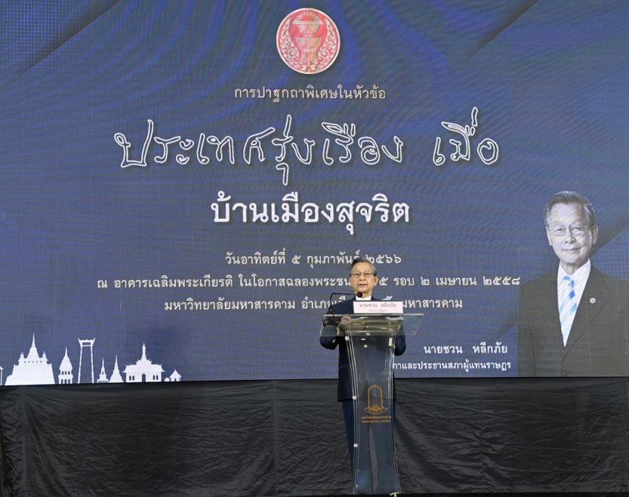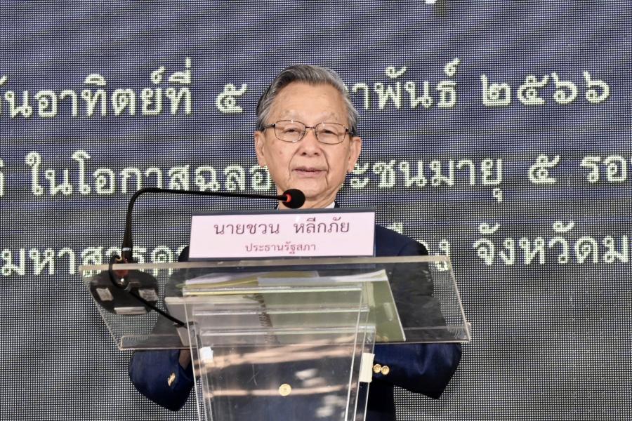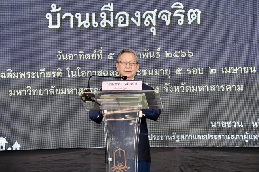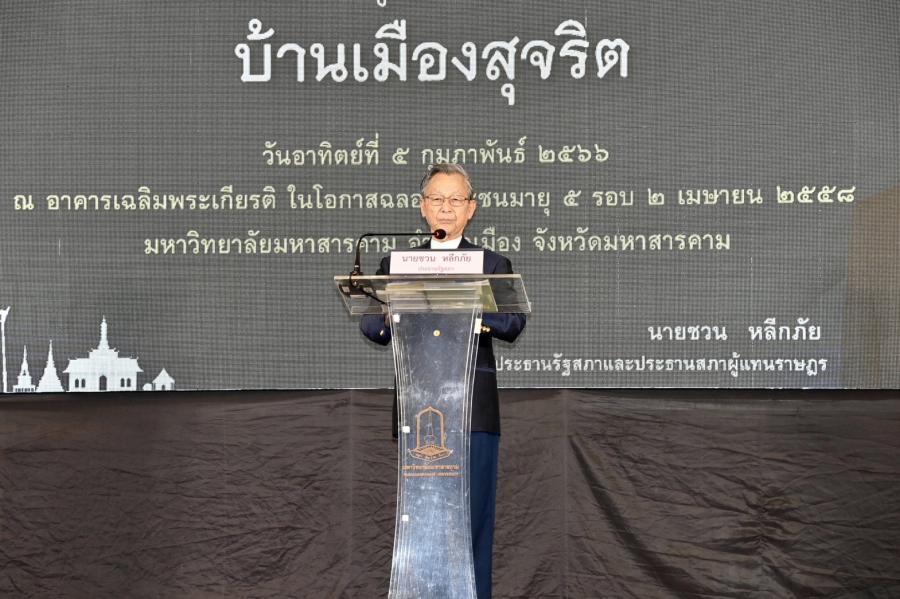 ประธานรัฐสภา เป็นประธานในพิธีเปิดโครงการส่งเสริมและปลูกฝังแนวคิดบ้านเมืองสุจริตไปสู่เยาวชนประจำปี 2566 พร้อมปาฐกถาพิเศษในหัวข้อ ประเทศรุ่งเรือง เมื่อบ้านเมืองสุจริต ณ อาคารเฉลิมพระเกียรติ ในโอกาสฉลองพระชนมายุ 5 รอบ 21 เมษายน 2558 มหาวิทยาลัยมหาสารคาม อำเภอเมือง จังหวัดมหาสารคาม