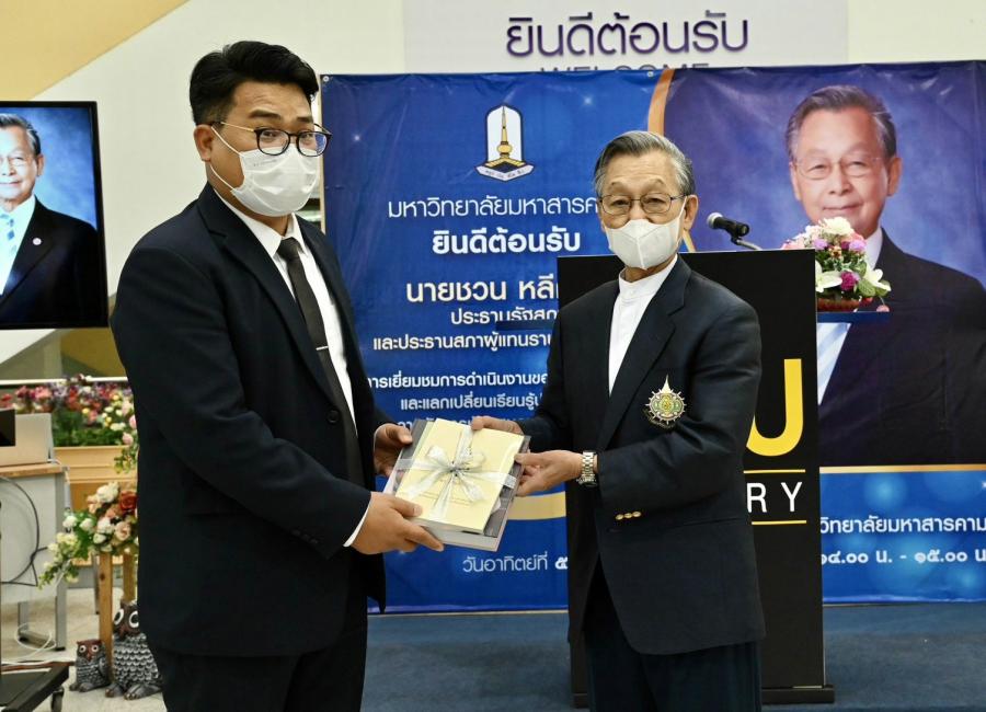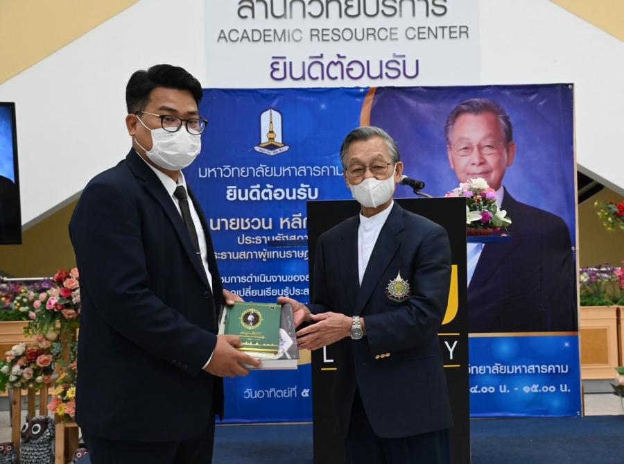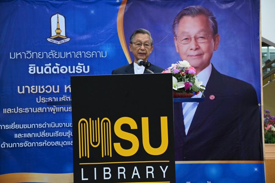 วันอาทิตย์ที่ 5 กุมภาพันธ์ 2566 เวลา 14.00 นาฬิกา ณ หอสมุดมหาวิทยาลัยมหาสารคาม ต.ขามเรียง   อ.กันทรวิชัย จ.มหาสารคาม นายชวน หลีกภัย ประธานรัฐสภาและประธานสภาผู้แทนราษฎร พร้อมคณะเยี่ยมชมการดำเนินงานของสำนักวิทยบริการ มหาวิทยาลัยมหาสารคาม ตามคำเชิญของ ผศ.มลฤดี เชาวรัตน์รองอธิการบดีฝ่ายบริหารและพัฒนาศักยภาพองค์กร ปฏิบัติราชการแทนอธิการบดีมหาวิทยาลัยมหาสารคาม โดยมี รศ.ดร.ประยุกต์ ศรีวิไล อธิการบดีมหาวิทยาลัยมหาสารคาม บรรยายสรุปการดำเนินงานของสำนักวิทยบริการ มหาวิทยาลัยมหาสารคาม