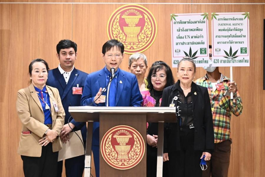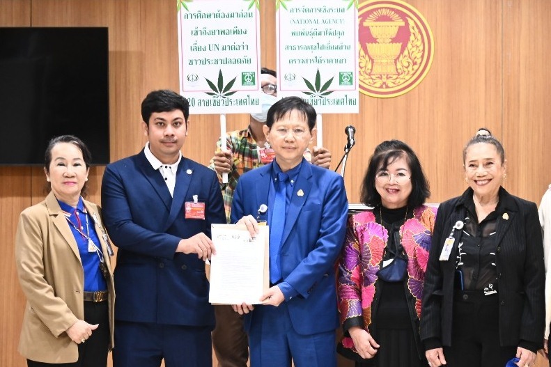 นายระวี มาศฉมาดล ส.ส.พรรคพลังธรรมใหม่ รับยื่นหนังสือจาก นายต้นน้ำ นิยมาภา บุตรชายของนายบัณฑูร นิยมาภา ผู้ได้รับการขนานนามว่า บิดากัญชาไทยภาคประชาชน และคณะ