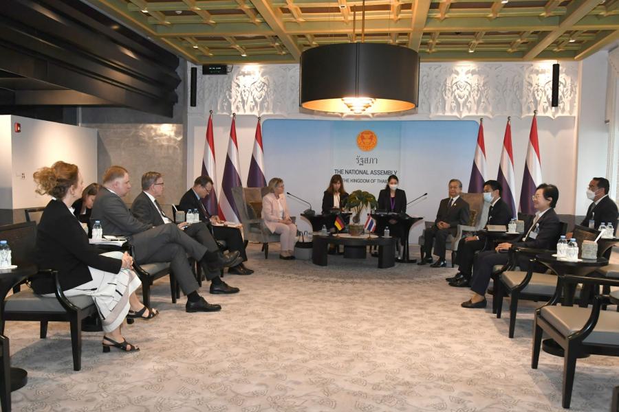 ประธานรัฐสภาและประธานสภาผู้แทนราษฎร ได้หารือกับประธานกลุ่มมิตรภาพรัฐสภาเยอรมนี – อาเซียน เกี่ยวกับความสัมพันธ์ระหว่างไทยและสหพันธ์สาธารณรัฐเยอรมนี ซึ่งดำเนินมาด้วยดีตลอดเวลาอันยาวนานถึง 160 ปี ถือเป็นความภาคภูมิใจของสองประเทศเป็นอย่างยิ่ง ทั้งนี้ ประธานรัฐสภาเมื่อครั้งดำรงตำแหน่งนายกรัฐมนตรีได้เคยเดินทางไปเยือนสหพันธ์สาธารณรัฐเยอรมนี ในปี 2538 ตามคำเชิญของนายเฮลมุท โคห์ล (Helmut  Kohl) นายกรัฐมนตรีสหพันธ์สาธารณรัฐเยอรมนีในขณะนั้น ทั้งสองฝ่ายเห็นพ้องว่าภายหลังสถานการณ์โรคโควิด-19 ซึ่งได้เริ่มคลี่คลายลงแล้ว ความสัมพันธ์ในระดับรัฐสภาจะกลับมามีความแน่นแฟ้นกันมากยิ่งขึ้น  ในด้านการเมือง ทั้งสองฝ่ายมีความสัมพันธ์ที่ดีต่อกันมาตลอด โดยได้หารือกันในเรื่องพัฒนาการทางการเมืองของไทย ซึ่งไทยได้มีการพัฒนาระบอบประชาธิปไตยมากว่า 90 ปี ทั้งนี้ รัฐธรรมนูญของไทย ฉบับปี พ.ศ. 2540 ได้ศึกษาระบบการเลือกตั้งของเยอรมนีเป็นแบบอย่าง อันเป็นการเริ่มต้นการใช้ระบบการเลือกตั้งแบบแบ่งเขตเลือกตั้งและระบบบัญชีรายชื่อ นอกจากนี้ ยังได้หารือกันถึงเรื่องความร่วมมือทางเศรษฐกิจการค้าระหว่างกัน  และการให้ความสำคัญกับการเปลี่ยนแปลงสภาพภูมิอากาศ รวมถึงเรื่องสิทธิมนุษยชน เพื่อให้ทั้งสองประเทศมีความร่วมมือระหว่างกันมากขึ้น