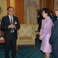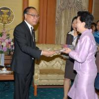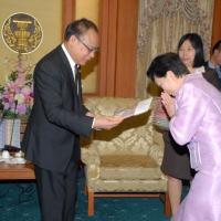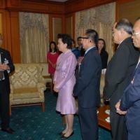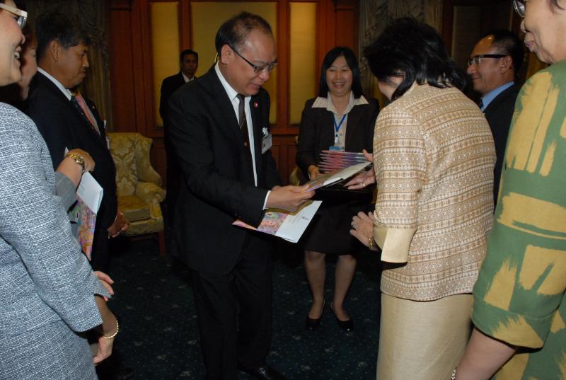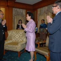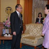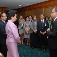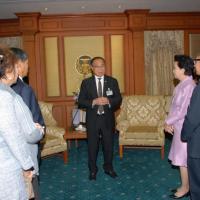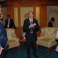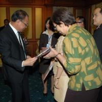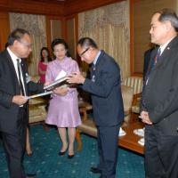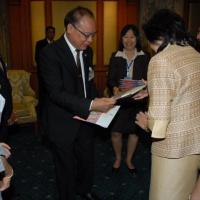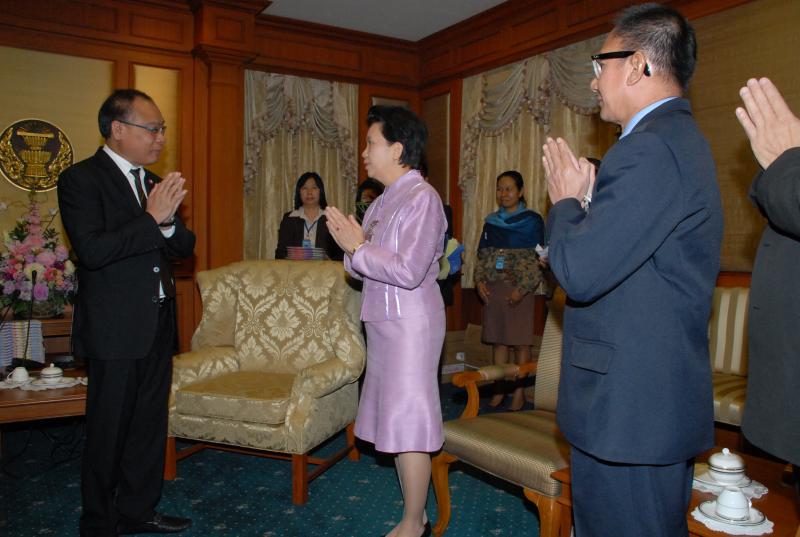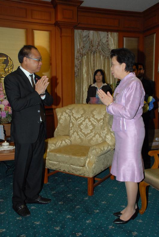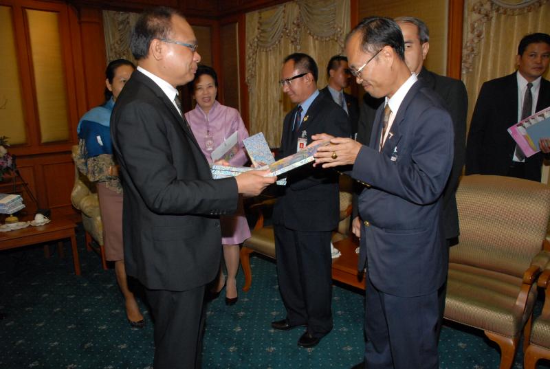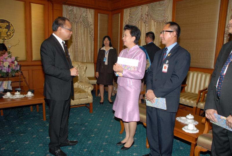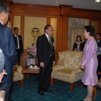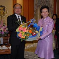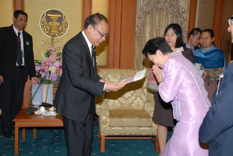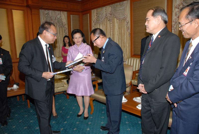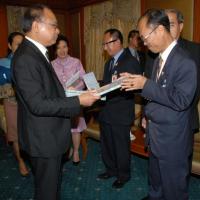 นายสมศักดิ์ เกียรติสุรนนท์ ประธานรัฐสภา และประธานสภาผู้แทนราษฎร รับกระเช้าผลไม้อวยพรปีใหม่จากนางนรรัตน์ พิมเสน เลขาธิการวุฒิสภา พร้อมด้วยผู้บริหารของสำนักงานเลขาธิการวุฒิสภา