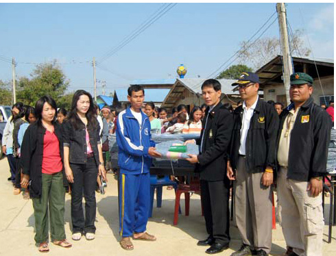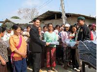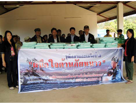 | นายโสภณ ศรีมาเหล็ก สมาชิกวุฒิสภาจังหวัดน่าน พร้อมด้วยตัวแทนมูลนิธิสิ่งแวดล้อมไทย ได้มอบของบริจาคให้กับผู้ประสบภัยหนาวในตำบลขุนน่าน อำเภอเฉลิมพระเกียรติ จังหวัดน่าน |