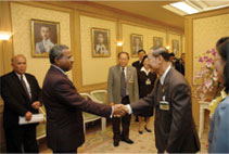 | เมื่อวันพฤหัสบดีที่ ๘ พฤษภาคม ๒๕๕๑ เวลา ๑๔.๓๐ นาฬิกา ณ ห้องรับรองพิเศษ ชั้น ๒ อาคาร รัฐสภา ๒ นายประสพสุข บุญเดช ประธานวุฒิสภา ได้ให้การรับรองนายอิบราฮิม นาอีม (Mr.Ibrahim Naeem) ผู้ว่าการตรวจเงินแผ่นดินแห่งสาธารณรัฐมัลดีฟส์ และคณะ รวม ๘ คน ในโอกาสเดินทางมาเยือนประเทศไทยอย่าง เป็นทางการในฐานะแขกของสำนักงานตรวจเงินแผ่นดินนำโดย คุณหญิงจารุวรรณ เมณฑกา ผู้ว่าการตรวจเงินแผ่นดิน จากนั้น คณะเข้ารับฟังบรรยายสรุปเกี่ยวกับบทบาท อำนาจหน้าที่และการปฏิบัติงานของสำนักงาน เลขาธิการวุฒิสภา โดยนายสุชาต อยู่ยอด รองเลขาธิการวุฒิสภา ณ ห้องประชุมคณะกรรมาธิการ หมายเลข ๓๐๙ ชั้น ๓ อาคารรัฐสภา ๒ |