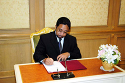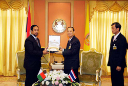 | เมื่ออังคารที่ ๔ พฤศจิกายน ๒๕๕๑ เวลา ๑๑.๐๐ ณ ห้องรับรองพิเศษ ชั้น ๒ อาคารรัฐสภา ๒ นายประสพสุข บุญเดช ประธานวุฒิสภา ได้ให้การรับรองนายจิมมี รามีอานดรีชง (H.E. Mr. Jimmy Ramiandrison) เอกอัครราชทูตสาธารณรัฐมาดากัสการ์ ประจำประเทศไทย ถิ่น พำนัก ณ กรุงโตเกียว เนื่องในโอกาสเดินทางมาประเทศไทยเพื่อเข้าเฝ้าฯ ถวายอักษรสาส์นตราตั้ง และเข้าเยี่ยมคารวะประธานวุฒิสภา ในโอกาสเข้ารับตำแหน่งใหม่ ทั้งสองฝ่ายได้แลกเปลี่ยนทัศนะใน ประเด็นต่างๆ ได้แก่ การค้าการลงทุนด้านเพชร พลอย เหมืองแร่ ประมง และอื่นๆ รวมถึงการ พัฒนาระหว่างประเทศให้ก้าวหน้าและมีความใกล้ชิดมากขึ้น นอกจากนี้ ได้มีการจัดทำและลงนามใน บันทึกเพื่อแสดงเจตนาในการที่จะให้วุฒิสภาของทั้งสองประเทศได้มีการสานสัมพันธ์ในความร่วมมือ ระหว่างองค์กรและส่วนบุคคลต่อไปให้แน่นแฟ้นยิ่งขึ้น |