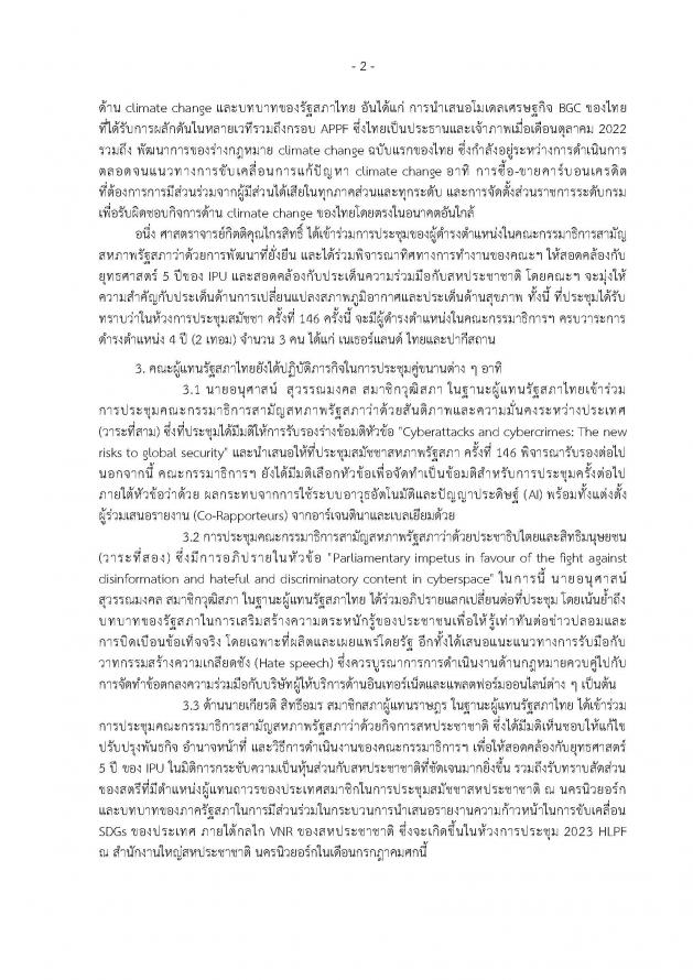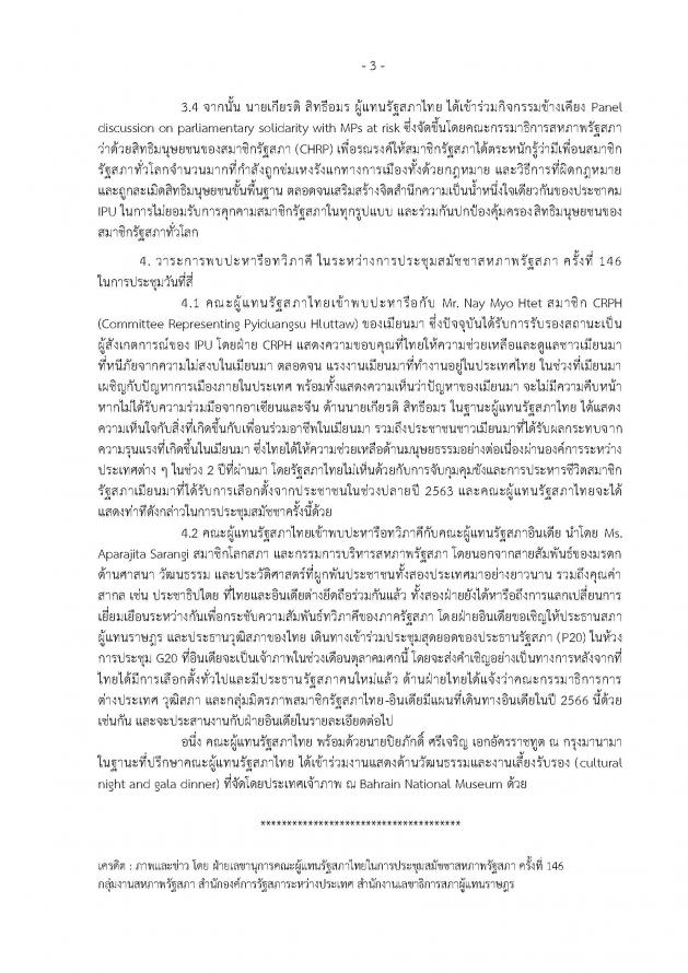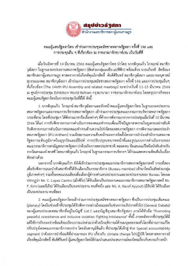 เมื่อวันอังคารที่ 14 มี.ค. 66 คณะผู้แทนรัฐสภาไทย นำโดย นางพิกุลแก้ว ไกรฤกษ์ สมาชิกวุฒิสภา ในฐานะรองประธานสหภาพรัฐสภา (สัดส่วนกลุ่มเอเชีย-แปซิฟิก) พร้อมด้วย นายเกียรติ  สิทธีอมร สมาชิกสภาผู้แทนราษฎร ศ.เกียรติคุณไกรสิทธิ์  ตันติศิรินทร์ สมาชิกวุฒิสภา และนายอนุศาสน์  สุวรรณมงคล สมาชิกวุฒิสภา เข้าร่วมการประชุมสมัชชาสหภาพรัฐสภา ครั้งที่ 146 และการประชุมอื่นๆ ที่เกี่ยวข้อง (The 146th IPU Assembly and related meetings) ระหว่างวันที่ 11-15 มี.ค. 66 ณ ศูนย์การประชุม Exhibition World Bahrain กรุงมานามา ราชอาณาจักรบาห์เรน