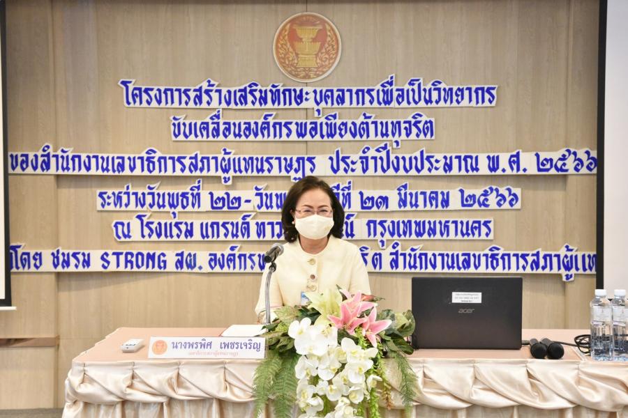 วันพุธที่ 22 มีนาคม 2566 เวลา 09.00 นาฬิกา ณ ห้องเพียงฟ้า ชั้น 23  โรงแรมแกรนด์ทาวเวอร์อินน์ พระรามหก กรุงเทพฯ นางพรพิศ เพชรเจริญ เลขาธิการสภาผู้แทนราษฎร เป็นประธานกล่าวเปิดโครงการเสริมสร้างบุคลากรเพื่อเป็นวิทยากรขับเคลื่อนองค์กรพอเพียงต้านทุจริตของสำนักงานเลขาธิการสภาผู้แทนราษฎรประจำปีงบประมาณพ.ศ. 2566 โดยมี นายชูพงศ์  นิลสกุล ผู้อำนวยการสำนักกรรมาธิการ 2 ในฐานะประธาน