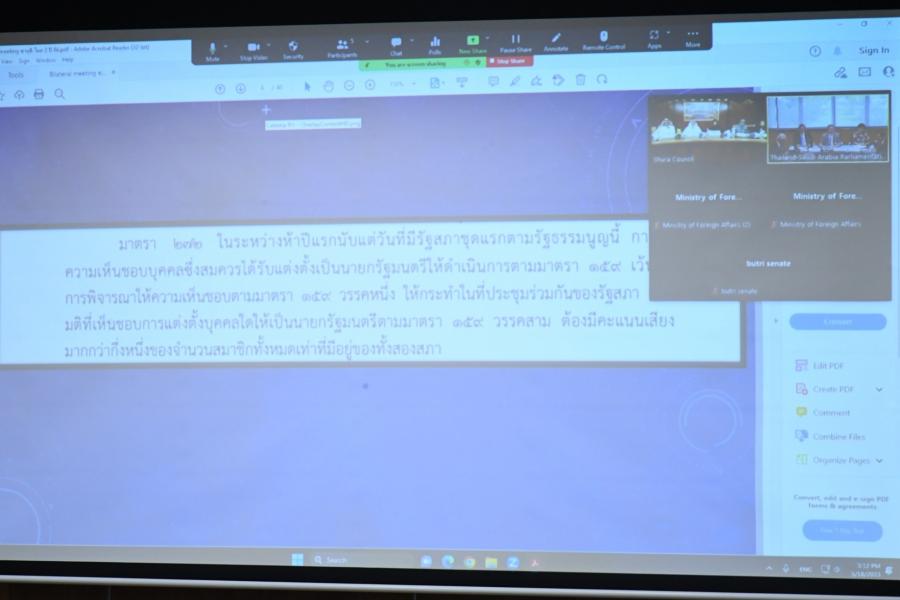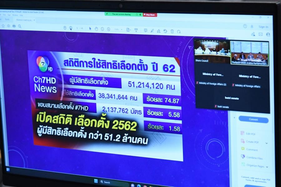 วันพฤหัสบดีที่ 18 พฤษภาคม 2566 เวลา 15.00 นาฬิกา ณ ห้องประชุม 407 ชั้น 4 อาคารรัฐสภา พล.อ.อ.ประจิน จั่นตอง สมาชิกวุฒิสภาในฐานะประธานกลุ่มมิตรภาพสมาชิกรัฐสภาไทย ซาอุดีอาระเบีย เป็นประธานการประชุมทวิภาคีกลุ่มมิตรภาพฯไทย ซาอุดีอาระเบีย ร่วมกับคณะกรรมาธิการมิตรภาพรัฐสภาซาอุดี - ไทยสภาที่ปรึกษาราชอาณาจักรซาอุดีอาระเบีย ครั้งที่ 2/2566 ผ่านสื่ออิเล็กทรอนิกส์เพื่อหารือเกี่ยวกับความสัมพันธ์ทางการเมือง เศรษฐกิจ และสังคมระหว่างประเทศไทยและราชอาณาจักรซาอุดีอาระเบีย ภายหลังการเลือกตั้งสมาชิกสภาผู้แทนราษฎร |