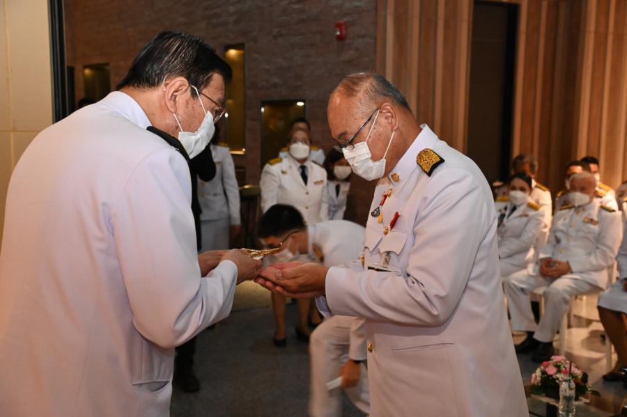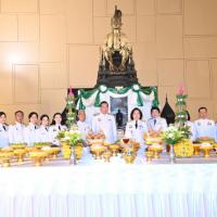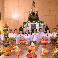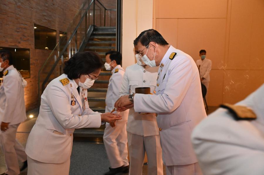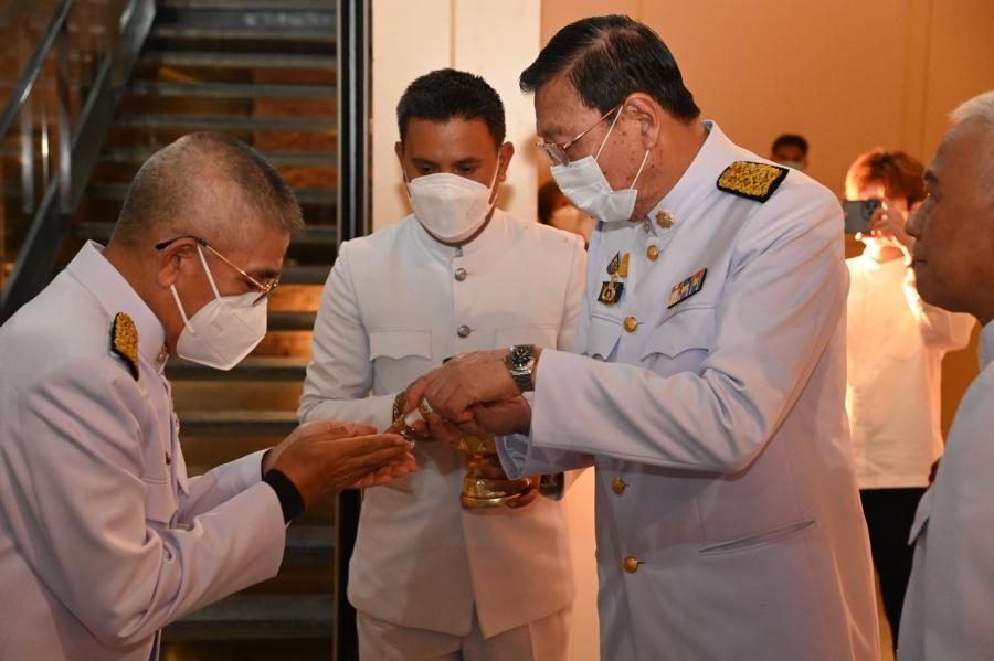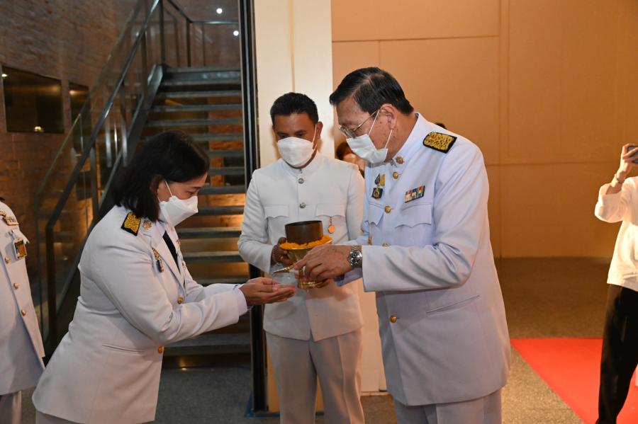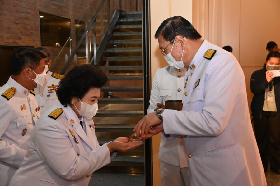 จากนั้น นายณัฐพงศ์ ปิ่นเงิน รองหัวหน้าโหรพราหมณ์ สำนักพระราชวัง ประกอบพิธีบวงสรวง และในเวลาต่อมา ศ.พิเศษพรเพชร วิชิตชลชัย  มอบน้ำเทพมนต์ ให้แก่ พลเอก สิงห์ศึก สิงห์ไพร รองประธานวุฒิสภา คนที่หนึ่ง นายศุภชัย สมเจริญ รองประธานวุฒิสภา คนที่สอง  สมาชิกวุฒิสภา นางพรพิศ เพชรเจริญ เลขาธิการสภาผู้แทนราษฎร น.ส.นภาภรณ์ ใจสัจจะ เลขาธิการวุฒิสภา คณะผู้บริหาร และแขกผู้มีเกียรติที่ร่วมพิธี
