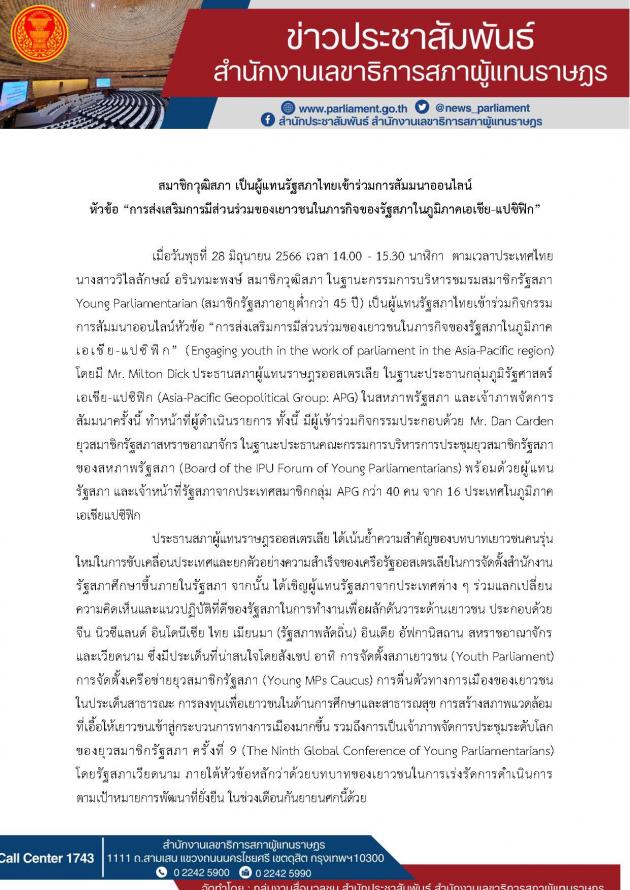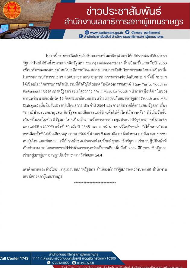 เมื่อวันพุธที่ 28 มิถุนายน 2566 เวลา 14.00 15.30 นาฬิกา ตามเวลาประเทศไทย น.ส. วิไลลักษณ์ อรินทมะพงษ์ สมาชิกวุฒิสภา ในฐานะกรรมการบริหารชมรมสมาชิกรัฐสภา Young Parliamentarian (สมาชิกรัฐสภาอายุต่ำกว่า 45 ปี) เป็นผู้แทนรัฐสภาไทยเข้าร่วมกิจกรรมการสัมมนาออนไลน์หัวข้อ การส่งเสริมการมีส่วนร่วมของเยาวชนในภารกิจของรัฐสภาในภูมิภาคเอเชีย-แปซิฟิก (Engaging youth in the work of parliament in the Asia-Pacific region)