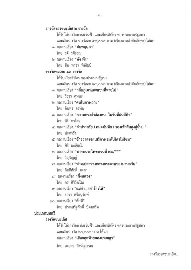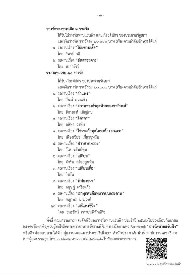 | วันพุธที่ 16 สิงหาคม 2566 เวลา 11.30 นาฬิกา ณ ห้องโถงชั้น 1 อาคารรัฐสภา นางพรพิศ เพชรเจริญ เลขาธิการสภาผู้แทนราษฎร ในฐานะประธานกรรมการรางวัลพานแว่นฟ้าปี 2566 พร้อมด้วย นายสกุล บุณยทัต อดีตนายกสมาคมนักเขียนแห่งประเทศไทย นางชมัยภร บางคมบาง ศิลปินแห่งชาติ สาขาวรรณศิลป์ ปี 2557 น.ส.โสมอุษา บูรณะเหตุ รองเลขาธิการสภาผู้แทนราษฎร ในฐานะรองกรรมการรางวัลพานแว่นฟ้า ปี 2566 และคณะกรรมการรางวัลพานแว่นฟ้า ปี 2566 แถลงข่าวผลการตัดสินวรรณกรรมรางวัลพานแว่นฟ้า ประจำปี 2566 โดยในปีนี้มีผลงานส่งเข้าประกวดทั้งสิ้น จำนวน 821 ผลงาน แบ่งเป็นประเภทเรื่องสั้น จำนวน 320 ผลงานและบทกวี จำนวน 501 ผลงาน สำหรับผลงานที่ได้รับรางวัลชนะเลิศประเภทเรื่องสั้น ได้แก่ ผลงานเรื่อง "การปรากฏตัวของเงาดำข้างศาลเจ้า" ของ คิรากร คัมคุณ และผลงานที่ได้รับรางวัลชนะเลิศประเภทบทกวี ได้แก่ผลงาน "เฮือกสุดท้ายของบทผญา" ของ องอาจ สิงห์สุวรรณ โดยผลงานที่ได้รับรางวัลชนะเลิศจะได้รับโล่รางวัลพานแว่นฟ้า เกียรติบัตรของประธานรัฐสภา และเงินรางวัลจำนวน 60,000 บาท ทั้งนี้ คณะกรรมการฯ จะจัดพิธีมอบรางวัลพานแว่นฟ้า ประจำปี 2566 ในช่วงเดือนกันยายน 2566 จึงขอเชิญชวนผู้สนใจติดตามข่าวสารการจัดงานพิธีมอบรางวัลทางเพจ Facebook "รางวัลพานแว่นฟ้า" |