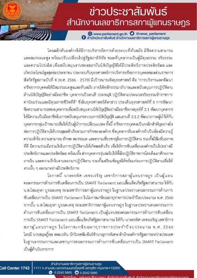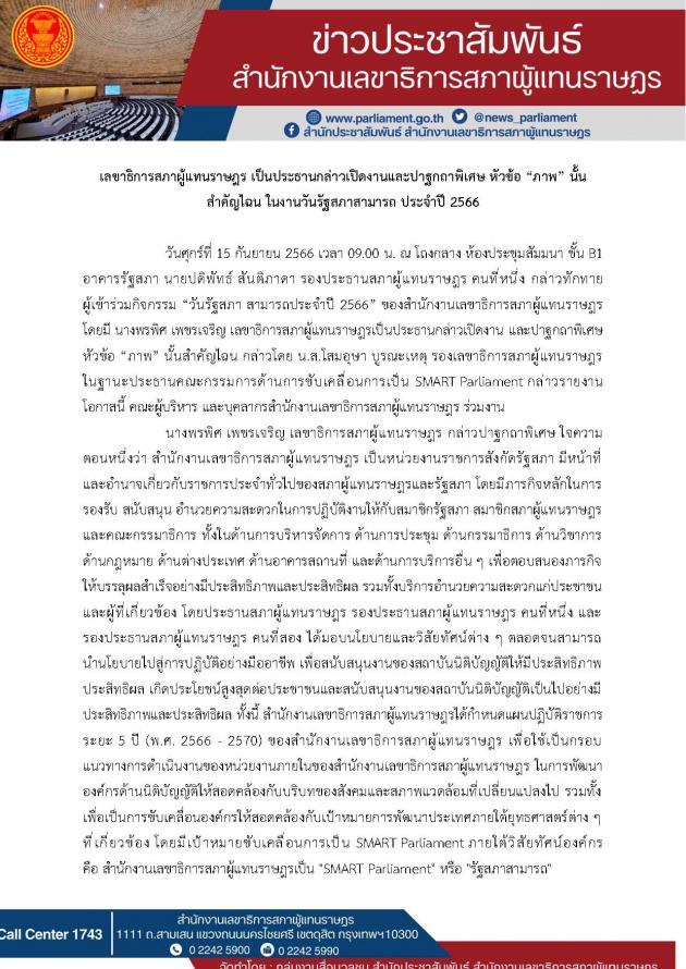 วันศุกร์ที่ 15 กันยายน 2566 เวลา 09.00 นาฬิกา ณ โถงกลางห้องประชุมสัมมนา ชั้น B1 อาคารรัฐสภา นายปดิพัทธ์ สันติภาดา รองประธานสภาผู้แทนราษฎร คนที่หนึ่ง กล่าวทักทายผู้เข้าร่วมงานวันรัฐสภาสามารถประจำปี 2566 โดยมี นางพรพิศ เพชรเจริญ เลขาธิการสภาผู้แทนราษฎร เป็นประธานกล่าวเปิดงานและปาฐกถาพิเศษ หัวข้อ ภาพ นั้นสำคัญไฉน กล่าวรายงานโดย น.ส.โสมอุษา บูรณะเหตุ รองเลขาธิการสภาผู้แทนราษฎร ในฐานะประธานคณะกรรมการด้านการขับเคลื่อนการเป็น SMART Parliament โอกาสนี้ คณะผู้บริหาร บุคลากรสำนักงานเลขาธิการสภาผู้แทนราษฎร ร่วมงาน