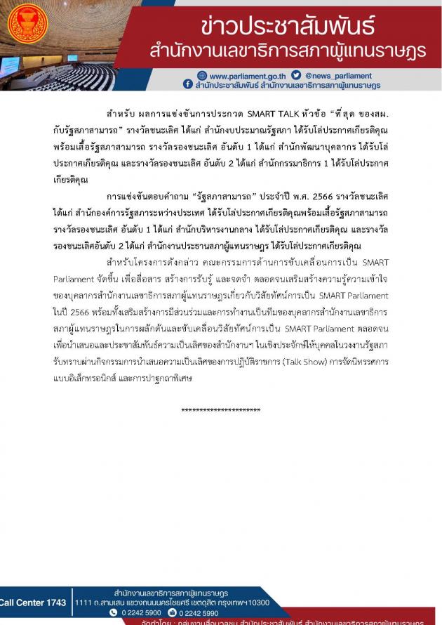 สำหรับ ผลการแข่งขันการประกวด SMART TALK หัวข้อ ที่สุด ของสผ. กับรัฐสภาสามารถ รางวัลชนะเลิศ ได้แก่ สำนักงบประมาณรัฐสภา รางวัลรองชนะเลิศ อันดับ 1 ได้แก่ สำนักพัฒนาบุคลากร รางวัลรองชนะเลิศ อันดับ 2 ได้แก่ สำนักกรรมาธิการ 1