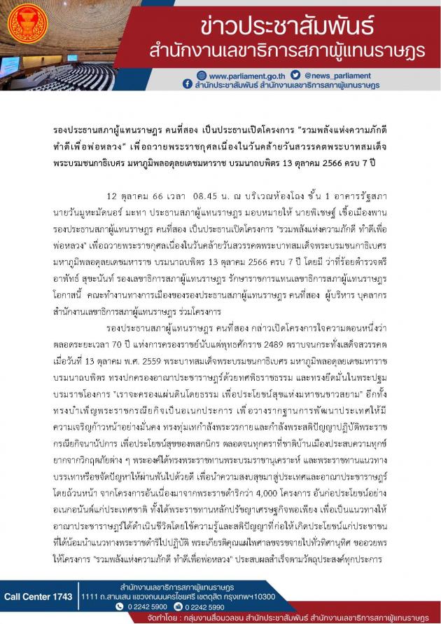 วันพฤหัสบดีที่ 12 ตุลาคม 2566 เวลา 08.45 นาฬิกา ณ บริเวณห้องโถง ชั้น 1 อาคารรัฐสภา นายวันมูหะมัดนอร์ มะทา ประธานสภาผู้แทนราษฎร มอบหมายให้ นายพิเชษฐ์ เชื้อเมืองพาน รองประธานสภาผู้แทนราษฎร คนที่สอง เป็นประธานเปิดโครงการ "รวมพลังแห่งความภักดี ทำดีเพื่อพ่อหลวง" เพื่อถวายพระราชกุศลเนื่องในวันคล้ายวันสวรรคตพระบาทสมเด็จพระบรมชนกาธิเบศร มหาภูมิพล อดุลยเดชมหาราช บรมนาถบพิตร 13 ตุลาคม 2566 ครบ 7 ปี โดยมี ว่าที่ร้อยตำรวจตรี อาพัทธ์ สุขะนันท์ รองเลขาธิการสภาผู้แทนราษฎร รักษาราชการแทนเลขาธิการสภาผู้แทนราษฎร โอกาสนี้ คณะทำงานทางการเมืองของรองประธานสภาผู้แทนราษฎร คนที่สอง ผู้บริหาร บุคลากร สำนักงานเลขาธิการสภาผู้แทนราษฎร ร่วมโครงการ