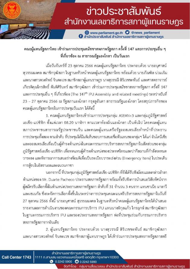 เมื่อวันจันทร์ที่ 23 ตุลาคม 2566 คณะผู้แทนรัฐสภาไทย ประกอบด้วย นายอนุศาสน์ สุวรรณมงคล สมาชิกวุฒิสภา ในฐานะหัวหน้าคณะผู้แทนรัฐสภาไทย พร้อมด้วย นายภัณฑิล น่วมเจิม และนางสาวตวงทิพย์ จินตะเวช สมาชิกสภาผู้แทนราษฎร นางสุวรรณี สิริเวชชะพันธ์ และศาสตราจารย์เกียรติคุณไกรสิทธิ์ ตันติศิรินทร์ สมาชิกวุฒิสภา เข้าร่วมการประชุมสมัชชาสหภาพรัฐสภา ครั้งที่ 147 และการประชุมอื่น ๆ ที่เกี่ยวข้อง (The 147th IPU Assembly and related meetings) ระหว่างวันที่ 23 27 ตุลาคม 2566 ณ รัฐสภาแองโกลา กรุงลูอันดา สาธารณรัฐแองโกลา