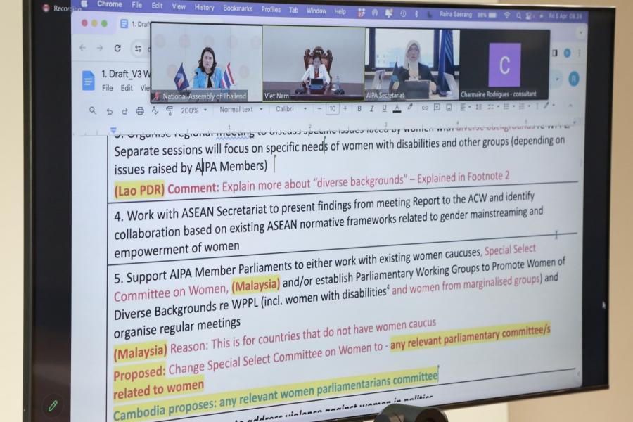 เสาหลักที่ 3: รัฐสภาและการตัดสินใจที่คำนึงถึงมิติหญิงชาย (การส่งเสริมรัฐสภาที่คำนึงถึงมิติหญิงชายและการตัดสินใจเชิงนโยบายที่คำนึงถึงมิติหญิงชาย) ทั้งนี้ เอกสารการดำเนินงานดังกล่าวจะแจ้งเวียนให้ประเทศสมาชิก AIPA พิจารณาเพื่อนำไปรับรองในที่ประชุมคณะกรรมาธิการด้านสมาชิกรัฐสภาสตรีของสมัชชารัฐสภาอาเซียน (WAIPA) ในห้วงการประชุมใหญ่สมัชชารัฐสภาอาเซียน ครั้งที่ 45 ต่อไป เครดิตข่าว: โดยกลุ่มงานสมัชชารัฐสภาอาเซียน สำนักองค์การรัฐสภาระหว่างประเทศ สำนักงานเลขาธิการสภาผู้แทนราษฎร