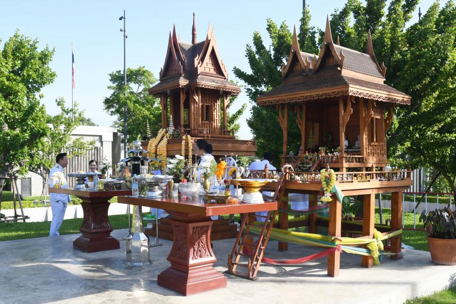 พระภูมิชัยมงคล และศาลตา - ยาย ประจำรัฐสภา ฝั่งสภาผู้แทนราษฎร ว่าที่ ร.ต.ต.อาพัทธ์ สุขะนันท์ เลขาธิการสภาผู้แทนราษฎร ถวายพวงมาลัย ถวายสำรับอาหาร และจุดธูปเทียนสักการะพระสยามเทวาธิราช พระเสื้อเมือง พระทรงเมือง และพระภูมิชัยมงคล พร้อมกล่าวคำบูชาพระสยามเทวาธิราชฯ เนื่องในวันที่ระลึกพระบาทสมเด็จพระปกเกล้าเจ้าอยู่หัว