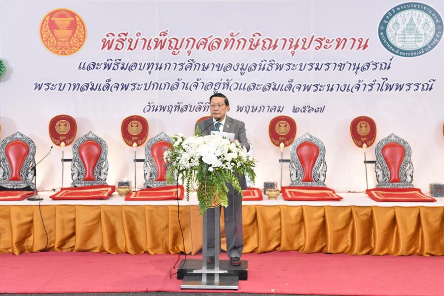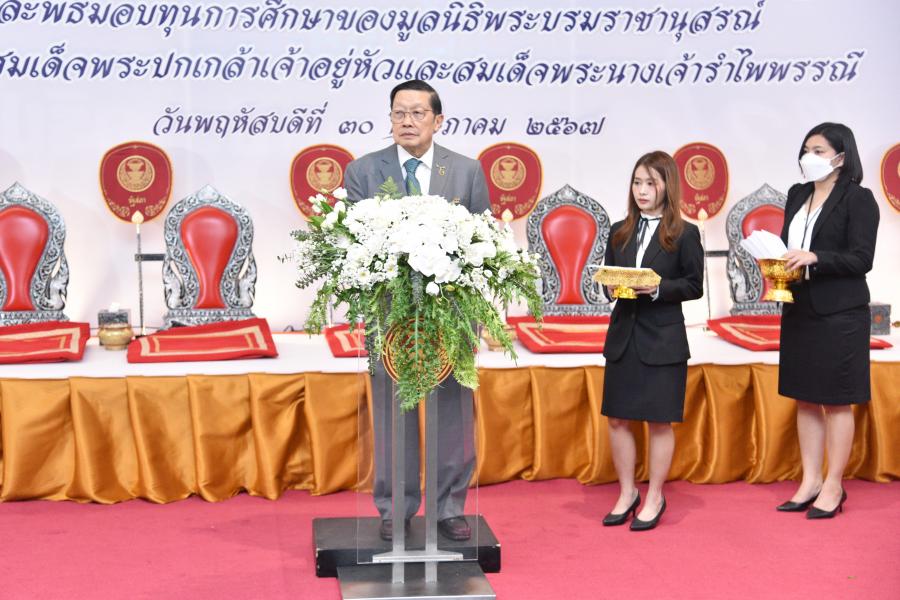 วันพฤหัสบดีที่ 30 พฤษภาคม 2567 เวลา 10.00 นาฬิกา ณ ห้องจัดประชุมสัมมนา ชั้น B1 อาคารรัฐสภา ศ.เกียรติคุณ ม.ร.ว.ชิษณุสรร สวัสดิวัตน์ รองประธานกรรมการมูลนิธิพระบรมราชานุสรณ์พระบาทสมเด็จพระปกเกล้าเจ้าอยู่หัวและสมเด็จพระนางเจ้ารำไพพรรณี เป็นประธานในพิธีมอบทุนการศึกษาแก่นักเรียนระดับประถมศึกษาตอนปลายที่สนใจเรียนทางสายวิทยาศาสตร์ ทุนนิสิตนักศึกษาระดับปริญญาตรี ทุนบุตรข้าราชการและลูกจ้างสำนักงานเลขาธิการสภาผู้แทนราษฎรและสำนักงานเลขาธิการวุฒิสภา ทุนการศึกษาแก่นักศึกษาพยาบาลในสังกัดกระทรวงสาธารณสุข และทุนการศึกษาแก่นิสิตนักศึกษาบัณฑิตศึกษา เพื่อใช้ในการค้นคว้าวิจัย โดยมี ว่าที่ ร.ต.ต.อาพัทธ์ สุขะนันท์ เลขาธิการสภาผู้แทนราษฎร ในฐานะกรรมการและเลขานุการมูลนิธิฯ กล่าวรายงาน จากนั้น รองประธานกรรมการมูลนิธิฯ กล่าวให้โอวาทแก่ผู้รับทุน