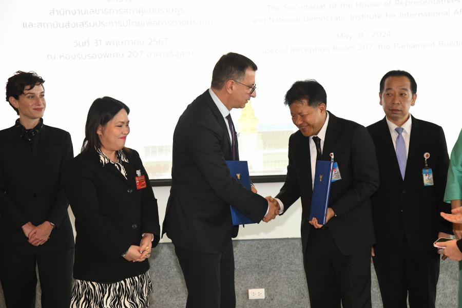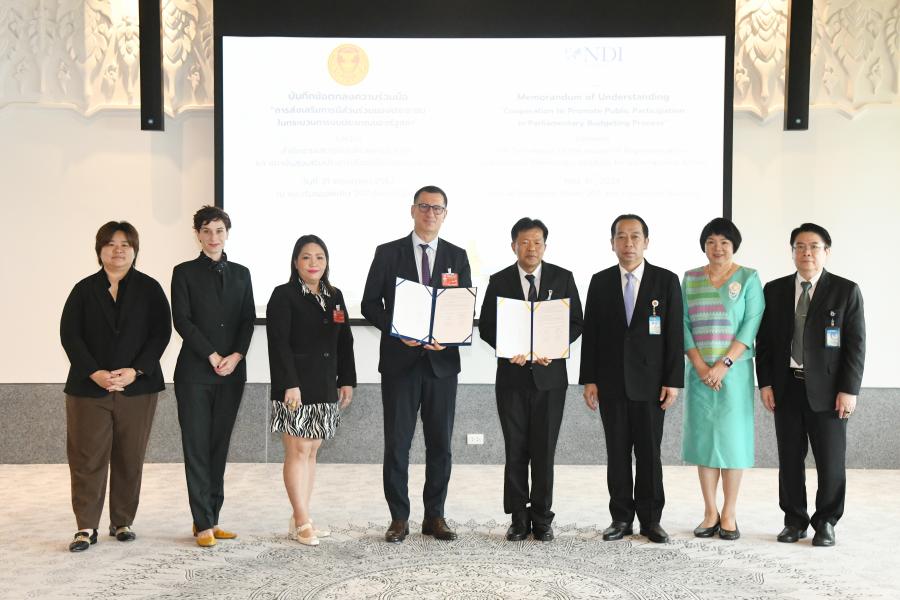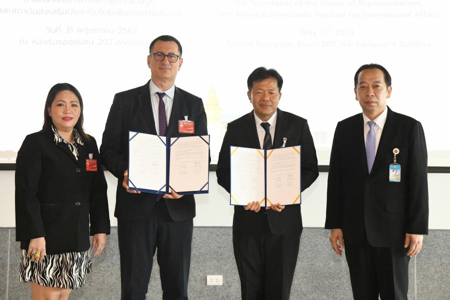 วันศุกร์ที่ 31 พฤษภาคม 2567 เวลา 10.00 นาฬิกา ณ ห้องรับรองพิเศษ 207 ชั้น 2 อาคารรัฐสภา ว่าที่ ร.ต.ต.อาพัทธ์ สุขะนันท์ เลขาธิการสภาผู้แทนราษฎร เป็นประธานในพิธีลงนามบันทึกความร่วมมือ เรื่อง การส่งเสริมการมีส่วนร่วมของประชาชนในกระบวนการงบประมาณของรัฐสภา ระหว่างสำนักงานเลขาธิการสภาผู้แทนราษฎร กับสถาบันส่งเสริมประชาธิปไตยเพื่อการต่างประเทศ (NDI) โดยนายเอ็ดมอนด์ เอเฟนดิจา ผู้อำนวยการ NDI ประจำประเทศไทย ในการนี้ นายศิโรจน์ แพทย์พันธุ์ และน.ส.สตีจิตร ไตรพิบูลย์สุข รองเลขาธิการสภาผู้แทนราษฎร ผู้บริหาร คณะผู้แทน NDI และข้าราชการที่เกี่ยวข้อง เข้าร่วม โอกาสนี้ ว่าที่ ร.ต.ต.อาพัทธ์ สุขะนันท์ กล่าวต้อนรับ นายเอ็ดมอนด์ เอเฟนดิจา ผู้อำนวยการ NDI ประจำประเทศไทย และคณะ ใจความว่า รู้สึกเป็นเกียรติอย่างยิ่งที่ได้เป็นประธานในพิธีลงนามบันทึกความร่วมมือ ในวันนี้ ซึ่งถือเป็นก้าวสำคัญที่แสดงถึงความมุ่งมั่นและความตั้งใจจริงของทั้งสองฝ่ายในการร่วมมือกันเพื่อเพิ่มขีดความสามารถของรัฐสภาผ่านการมีส่วนร่วมในกระบวนการงบประมาณของประชาชนผ่านกิจกรรมการเสริมสร้างและแลกเปลี่ยนองค์วามรู้ วิธีการปฏิบัติที่เป็นเลิศด้านการมีส่วนร่วมของประชาชนในกระบวนการงบประมาณของรัฐสภา และการแสวงหาความร่วมมือจากภาคส่วนต่าง ๆ โดยความร่วมมือในครั้งนี้อยู่ภายใต้กรอบอำนาจหน้าที่ของทั้ง 2 หน่วยงาน โดยเน้นความร่วมมือด้านวิชาการ ซึ่งจะส่งผลดีต่อการสนับสนุนบทบาทของฝ่ายนิติบัญญัติในการพิจารณางบประมาณรายจ่ายประจำปี รวมถึงการติดตาม ตรวจสอบ และถ่วงดุลการบริหารราชการแผ่นดินให้มีความโปร่งใส และสามารถพัฒนาประชาธิปไตยให้มีความเข้มแข็งมากยิ่งขึ้นขอขอบคุณสถาบันส่งเสริมประชาธิปไตยเพื่อการต่างประเทศสำหรับความร่วมมือในครั้งนี้ และหวังว่าการจัดทำบันทึกข้อตกลงความร่วมมือนี้จะส่งเสริมการทำงานตอบสนองต่อภารกิจของทั้ง 2 ฝ่าย และยังก่อประโยชน์แก่ประเทศชาติ และประชาชน ซึ่งนำไปสู่ผลลัพธ์ที่เป็นประโยชน์ต่อทุกฝ่าย