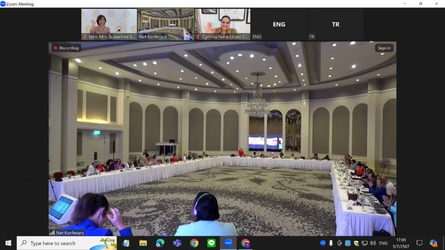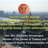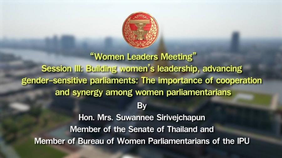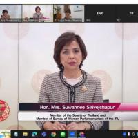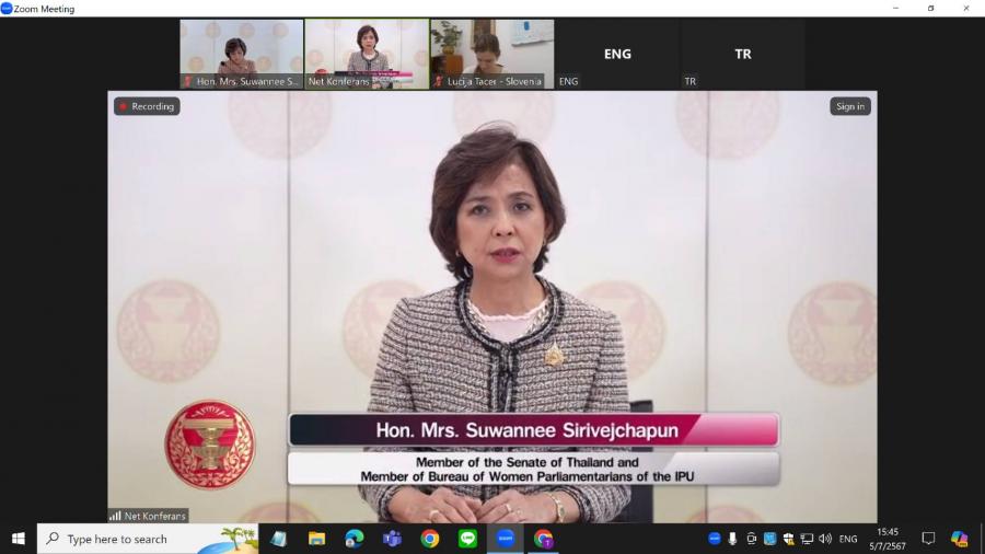 เมื่อวันศุกร์ที่ 5 กรกฎาคม 2567 เวลา 15.00 17.00 นาฬิกา นางสุวรรณี สิริเวชชะพันธ์ สมาชิกวุฒิสภา เข้าร่วมการประชุมออนไลน์ในการประชุมผู้นำสตรี Women Leaders Meeting) ซึ่งจัดขึ้น ณ นครอิสตันบูล สาธารณรัฐตุรกี การประชุมนี้จัดขึ้นโดยความร่วมมือของสหภาพรัฐสภา (IPU) UN Women และสำนักงานความร่วมมือเพื่อการพัฒนาระหว่างประเทศแห่งสวีเดน (Sida) โอกาสนี้ นางสุวรรณี ได้รับเชิญให้เป็นผู้อภิปรายในหัวข้อ การสร้างความเป็นผู้นำแก่สตรี ความก้าวหน้าสู่รัฐสภาที่คำนึงถึงมิติทางเพศ : ความสำคัญของความร่วมมือและการทำงานร่วมกันระหว่างสมาชิกรัฐสภาสตรี โดยมีผู้อภิปรายร่วมจากเคนยา เม็กซิโก และสโลวีเนีย ซึ่งนางสุวรรณี ได้กล่าวถึง การดำเนินงานในส่วนของประเทศไทยเพื่อให้เป็นไปตามอนุสัญญาว่าด้วยการขจัดการเลือกปฏิบัติต่อสตรีในทุกรูปแบบ (Convention on the Elimination of All Forms of Discrimination Against Women - CEDAW) ปฏิญญาปักกิ่งและแผนปฏิบัติการ (Beijing Declaration and Platform for Action) รวมทั้งเป้าหมายการพัฒนาที่ยั่งยืน (SDGs) เป้าหมายที่ 5 โดยในการพิจารณางบประมาณของฝ่ายนิติบัญญัติได้นำหลักการการจัดทำงบประมาณที่คำนึงถึงมิติทางเพศ (Gender Responsive Budgeting GRB) ซึ่งระบุไว้ในรัฐธรรมนูญมาปรับใช้ด้วย นอกจากนี้ ยังแสดงให้ที่ประชุมเห็นถึงความก้าวหน้าในการดำเนินงานด้านสตรีหลังจากที่แผนปฏิบัติการเพื่อรัฐสภาที่คำนึงถึงมิติทางเพศ (IPU Plan of Action for Gender-sensitive Parliaments) ได้รับการรับรองมาแล้วเป็นเวลา 12 ปี นับจากการประชุมสมัชชาสหภาพรัฐสภา ครั้งที่ 127 ณ เมืองควิเบก แคนาดา จำนวนสมาชิกสภาผู้แทนราษฎรผู้หญิงที่เพิ่มขึ้นเปรียบเทียบกับสภาชุดที่แล้ว จำนวนผู้บริหารของสำนักงานเลขาธิการของทั้งสองสภาที่เป็นผู้หญิงก็มีจำนวนเกือบร้อยละ 50 โดยเลขาธิการวุฒิสภาขณะนี้เป็นสตรีอีกด้วย หรือจำนวนของประธานคณะ กมธ.ที่เป็นสตรีที่มีเท่ากับสภาชุดที่แล้ว หากแต่ได้ดำรงตำแหน่งประธานในคณะ กมธ. ที่มีความสำคัญ เช่น คณะ กมธ.การพลังงาน คณะ กมธ.การสื่อสาร โทรคมนาคม และดิจิทัลเพื่อเศรษฐกิจและสังคม และคณะ กมธ.การคุ้มครองผู้บริโภค เป็นต้น