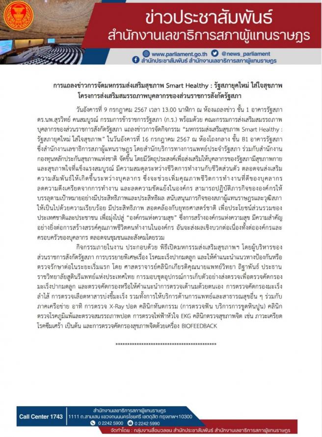 วันอังคารที่ 9 กรกฎาคม 2567 เวลา 13.00 นาฬิกา ณ ห้องแถลงข่าว ชั้น 1 อาคารรัฐสภา ดร.นพ.สุรวิทย์ คนสมบูรณ์ กรรมการข้าราชการรัฐสภา (ก.ร.) พร้อมด้วย คณะกรรมการส่งเสริมสมรรถภาพบุคลากรของส่วนราชการสังกัดรัฐสภา แถลงข่าว การจัดกิจกรรม มหกรรมส่งเสริมสุขภาพ Smart Healthy : รัฐสภายุคใหม่ ใส่ใจสุขภาพ ในวันอังคารที่ 16 ก.ค. 67 ณ ห้องโถงกลาง ชั้น B1 อาคารรัฐสภา ซึ่งสำนักงานเลขาธิการสภาผู้แทนราษฎร โดยสำนักบริการทางการแพทย์ประจำรัฐสภา ร่วมกับ สำนักงานกองทุนหลักประกันสุขภาพแห่งชาติ จัดขึ้นเพื่อส่งเสริมให้บุคลากรของรัฐสภามีสุขภาพกายและสุขภาพใจที่แข็งแรงสมบูรณ์ สามารถปฏิบัติภารกิจขององค์กรให้บรรลุตามเป้าหมายอย่างมีประสิทธิภาพและประสิทธิผล สนับสนุนภารกิจของสภาผู้แทนราษฎรและวุฒิสภาให้เป็นไปด้วยความเรียบร้อย มีประสิทธิภาพ สอดคล้องกับยุทธศาสตร์ชาติ เพื่อประโยชน์ส่วนรวมของประเทศชาติและประชาชน เพื่อมุ่งไปสู่ องค์กรแห่งความสุข