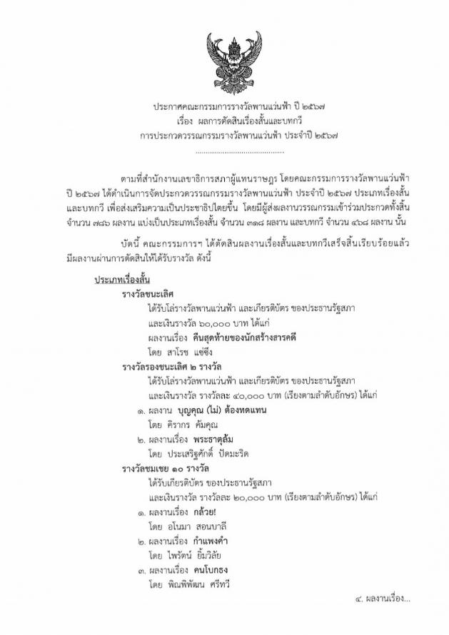 ทั้งนี้ สำนักงานเลขาธิการสภาผู้แทนราษฎร โดยคณะกรรมการรางวัลพานแว่นฟ้า ปี 2567 ได้จัดประกวดวรรณกรรมรางวัลพานแว่นฟ้า ประจำปี 2567 ประเภทเรื่องสั้นและบทกวี เพื่อส่งเสริมความเป็นประชาธิปไตย โดยเปิดรับผลงานเข้าประกวดฯ ตั้งแต่ 25 มกราคม ถึงวันที่ 9 เมษายน 2567 ซึ่งปีนี้มีผลงานส่งเข้าประกวดทั้งสิ้น จำนวน 786 ผลงาน แบ่งเป็นประเภทเรื่องสั้น จำนวน 318 ผลงาน และบทกวี จำนวน 468 ผลงาน การพิจารณาตัดสินแบ่งเป็น 3 รอบ รอบแรก โดย คณะอนุกรรมการกลั่นกรอง รอบที่ 2 โดย คณะอนุกรรมการคัดเลือก ตัดสินรอบสุดท้าย โดย คณะกรรมการรางวัลพานแว่นฟ้า