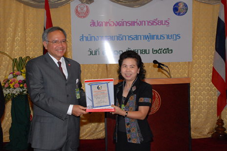 | วันศุกร์ที่ ๑๑ กันยายน ๒๕๕๒ เวลา ๐๙.๐๐ นาฬิกา ณ บริเวณห้องโถง ชั้นล่าง อาคารรัฐสภา ๑ นายพิทูร พุ่มหิรัญ เลขาธิการสภาผู้แทนราษฎร เป็นประธานมอบรางวัลการสร้างสรรค์องค์ความรู้และใบประกาศเกียรติคุณ ให้แก่สำนัก/กลุ่มงานที่ได้ร่วมกันจัดกิจกรรมในงานสัปดาห์องค์กรแห่งการเรียนรู้ของสำนักงานเลขาธิการสภาผู้แทนราษฎร |