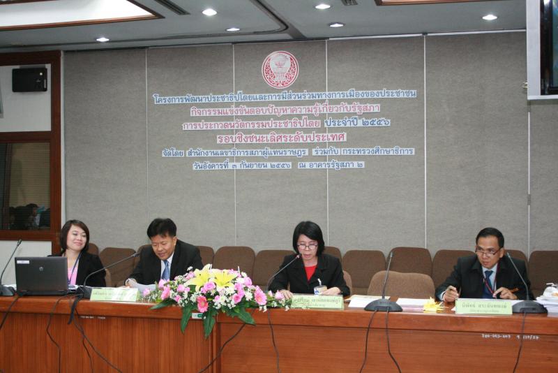 วันอังคารที่ ๓ กันยายน ๒๕๕๖  เวลา ๐๘.๓๐ นาฬิกา  ณ  ห้องประชุมคณะกรรมาธิการ หมายเลข ๒๑๓ - ๒๑๖ ชั้น ๒ อาคารรัฐสภา ๒ สำนักงานเลขาธิการสภาผู้แทนราษฎร  ร่วมกับกระทรวงศึกษาธิการ  จัดโครงการพัฒนาประชาธิปไตยและการมีส่วนร่วมทางการเมืองของประชาชน "กิจกรรมแข่งขันตอบปัญหาความรู้เกี่ยวกับรัฐสภา การประกวดนวัตกรรมประชาธิปไตย ประจำปี ๒๕๕๖" รอบชิงชนะเลิศระดับประเทศ