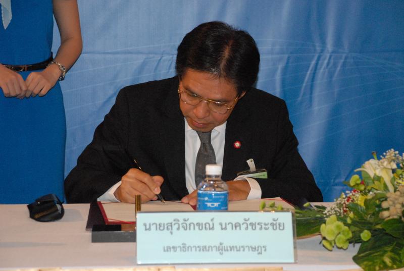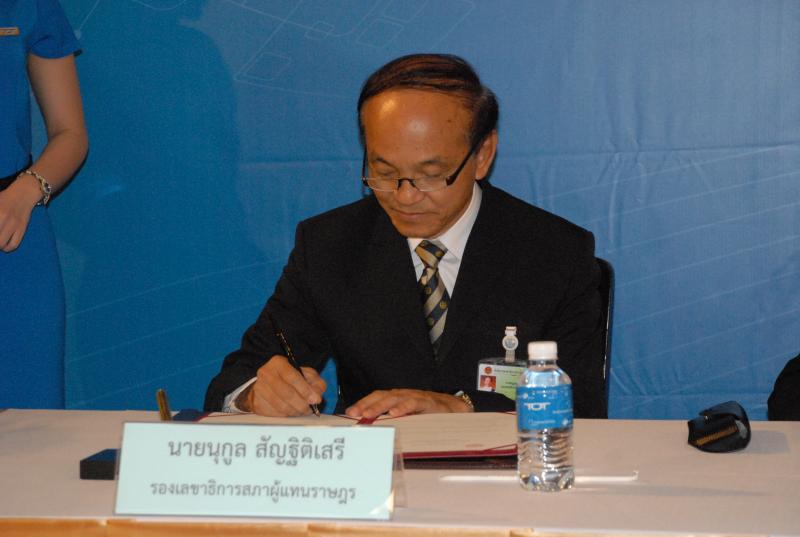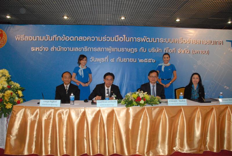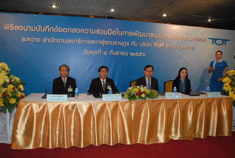 นายสุวิจักขณ์ นาควัชระชัย เลขาธิการสภาผู้แทนราษฎร นายนุกูล สัญฐิติเสรี รองเลขาธิการสภาผู้แทนราษฎร ร่วมลงนามบันทึกข้อตกลงความร่วมมือในการพัฒนาระบบเครือข่ายสารสนเทศ ระหว่างสำนักงานเลขาธิการสภาผู้แทนราษฎร กับ บริษัท ทีโอที จำกัด (มหาชน)