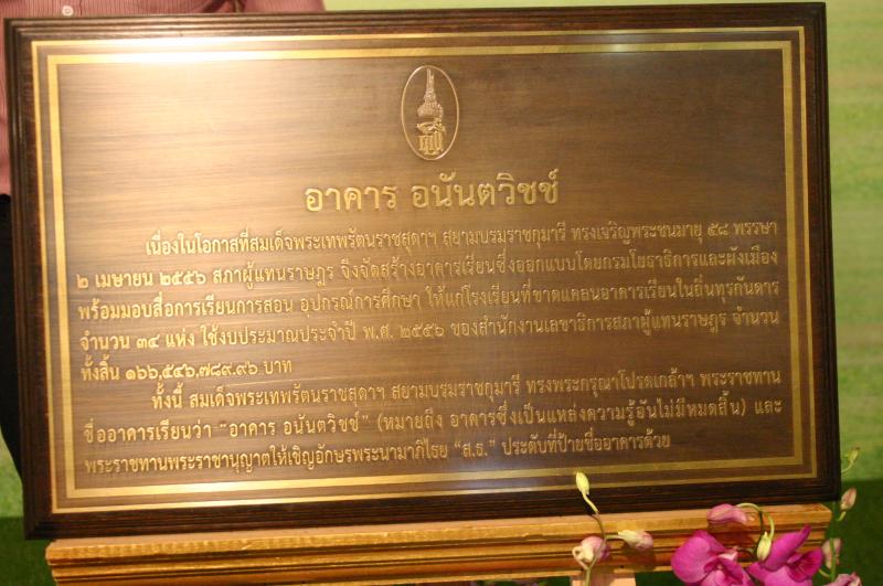 วันจันทร์ที่ ๒๑ กรกฎาคม ๒๕๕๗ เวลา ๐๙.๐๐ นาฬิกา ณ บริเวณห้องโถง อาคารรัฐสภา ๑ นายจเร พันธุ์เปรื่อง เลขาธิการสภาผู้แทนราษฎร เป็นประธานในพิธีเปิดและส่งมอบอาคารเรียนเฉลิมพระเกียรติฯ อนันตวิชช์ให้แก่โรงเรียนที่ขาดแคลนอาคารเรียนในถิ่นทุรกันดาร จำนวน ๓๔ แห่ง โดยมีวัตถุประสงค์เพื่อเฉลิมพระเกียรติสมเด็จพระเทพรัตนราชสุดาฯ สยามบรมราชกุมารี ทรงเจริญพระชนมพรรษา ๕๘ พรรษา ๒ เมษายน ๒๕๕๖ และเพื่อเจริญรอยตามพระราชปณิธานด้านการศึกษา รวมทั้งเพิ่มโอกาสทางการศึกษาแก่เด็กและเยาวชนที่อยู่ในถิ่นทุรกันดาร ให้ได้รับโอกาสทางการศึกษาอย่างเท่าเทียม |