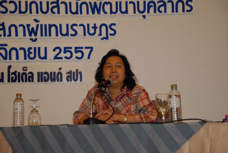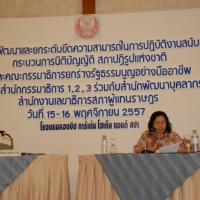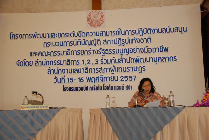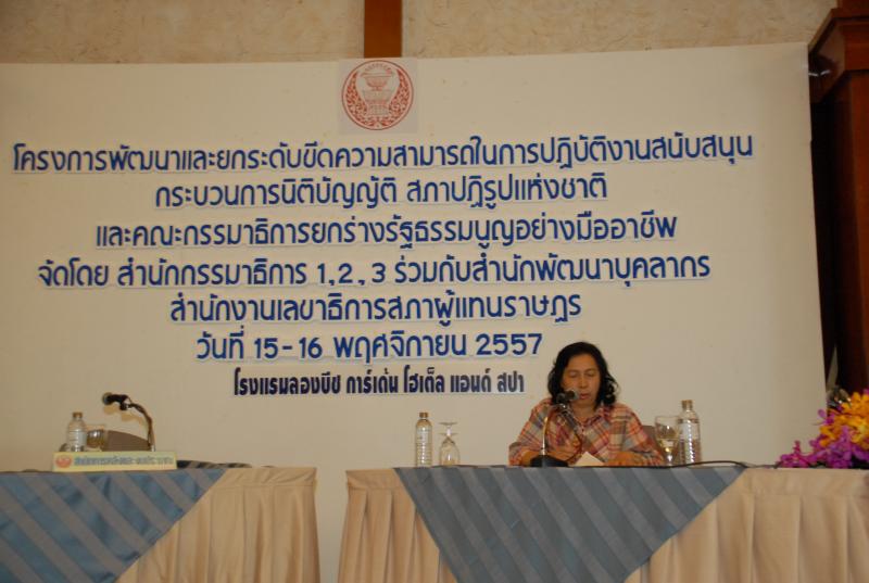 วันอาทิตย์ที่ ๑๖ พฤศจิกายน ๒๕๕๗ เวลา ๑๓.๐๐ - ๑๔.๐๐นาฬิกา ณ โรงแรมลองบีช การ์เด้น โฮเต็ล แอนด์ สปา จังหวัดชลบุรี  ซึ่งเป็นวันสุดท้ายของการสัมมนา  โครงการพัฒนาและยกระดับขีดความสามารถในการปฏิบัติงานสนับสนุนกระบวนการนิติบัญญัติ สภาปฏิรูปแห่งชาติ และคณะกรรมาธิการยกร่างรัฐธรรมนูญอย่างมืออาชีพฯ นางพรรณิภา เสริมศรี ที่ปรึกษาด้านกฎหมาย สรุปผลการสัมมนาของโครงการ และกล่าวปิดการสัมมนา