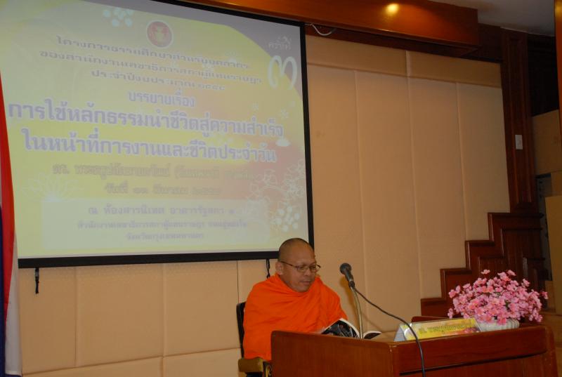 | วันศุกร์ที่ ๑๓ มีนาคม ๒๕๕๘ เวลา ๐๙.๐๐ นาฬิกา ณ ห้องสารนิเทศ อาคารรัฐสภา ๑ ดร. พระครูปลัดนายกวัฒน์ วัดเทพนารี บางพลัด บรรยายธรรมเรื่อง " การใช้หลักธรรมนำชีวิตสู่ความสำเร็จในหน้าที่การงานและชีวิตประจำวัน " โดยมีวัตถุประสงค์ เพื่อให้บุคลากรของสำนักงานเลขาธิการสภาผู้แทนราษฎรได้ตระหนักถึงความสำคัญในการประพฤติปฏิบัติที่สามารถจะนำมาเป็นแนวทางในการปฏิบัติตนให้เกิดความสงบสุขในชีวิตได้และนำหลักธรรมมาใช้ในการปฏิบัติงานเพื่อให้เกิดประสิทธิภาพในการทำงาน รวมทั้งได้มีโอกาสบำเพ็ญบุญกุศลเพื่อขัดเกลากิเลส บ่มนิสัย ซึ่งจะนำไปสู่การเป็นบุคลากรที่มีคุณธรรมและจริยธรรม |