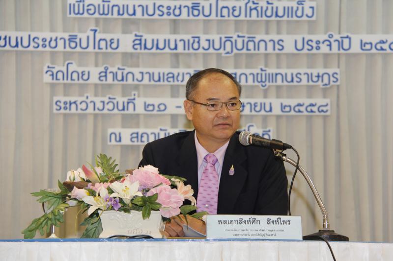 วันพุธที่ ๒๒ เมษายน ๒๕๕๘ เวลา ๐๙.๐๐ นาฬิกา พลเอกสิงห์ศึก สิงห์ไพร ประธานกรรมาธิการการพาณิชย์ การอุตสาหกรรม และการแรงงาน สภานิติบัญญัติแห่งชาติ ประธานในพิธีเปิดกิจกรรมยุวชนประชาธิปไตย สัมมนาเชิงปฏิบัติการ ประจำปี ๒๕๕๘ รุ่นที่ ๒ ณ สถาบันวิชาการทีโอที จังหวัดนนทบุรี โดยมีนายจเร พันธุ์เปรื่อง เลขาธิการสภาผู้แทนราษฎร กล่าวรายงาน ทั้งนี้ นายประวิช ตั้งใจมั่น ผู้อำนวยการสำนักประชาสัมพันธ์ นางสาวขวัญเรือน สังข์ประไพ ผู้บังคับบัญชากลุ่มงานเผยแพร่ประชาธิปไตยและกิจกรรมสภาผู้แทนราษฎร เข้าร่วมในพิธีเปิดด้วย