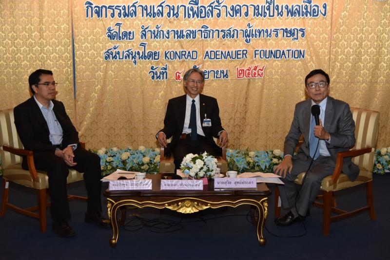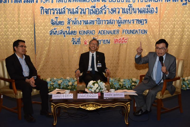 วันศุกร์ที่ ๔ กันยายน ๒๕๕๘ เวลา ๑๐.๐๐ นาฬิกา ณ บริเวณห้องโถง อาคารรัฐสภา ๑ มีการสานเสวนา เรื่อง "การสร้างพลเมืองให้เป็นใหญ่ในประเทศไทย" โดย นายวัลลภ ตังคณานุรักษ์ สมาชิกสภานิติบัญญัติแห่งชาติ และนายบัณฑูร เศรษฐศิโรตม์ สมาชิกสภาปฏิรูปแห่งชาติ ดำเนินรายการโดย นายสุวิช สุทธิประภา ผู้อำนวยการคลื่นวิทยุเอฟเอ็ม ๙๖.๕ อสมท.
